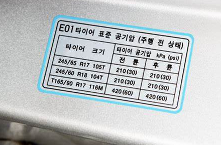 YF 소나타 타이어 인치에 따른 공기압 적정 수치