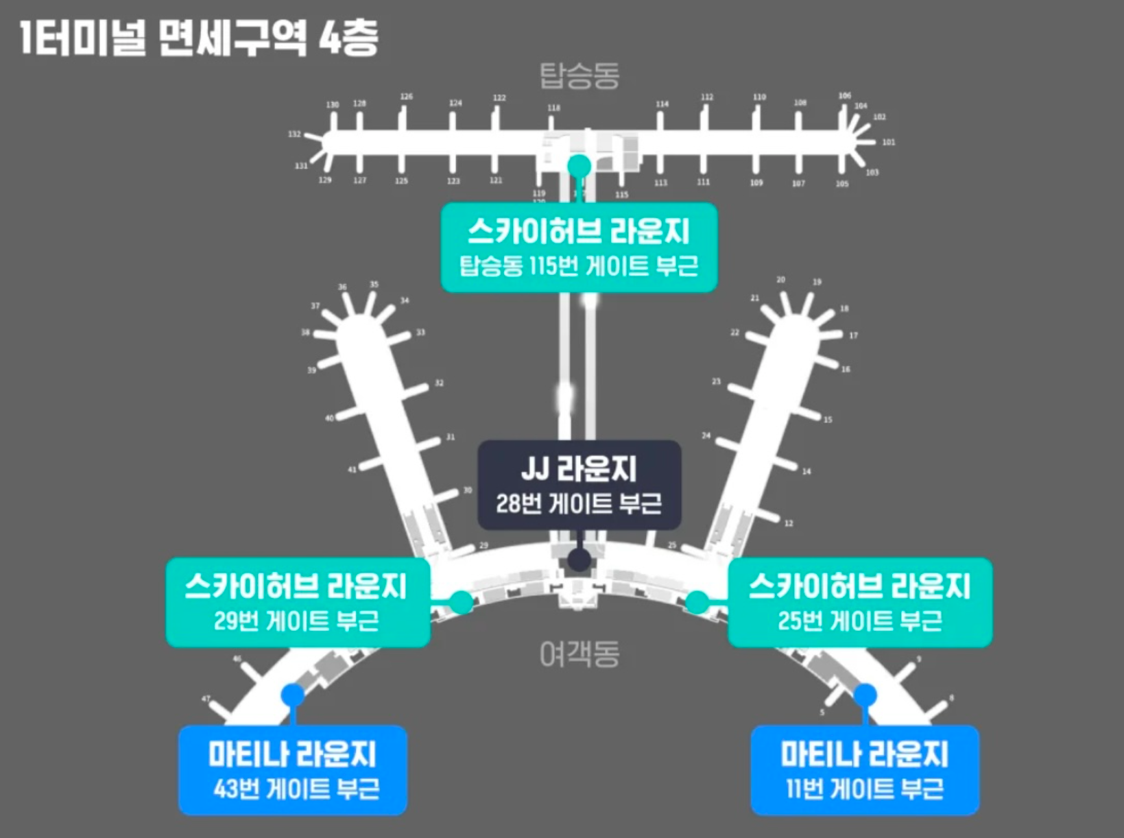 - 서편 라운지: 43번 게이트 맞은편 4층에 위치. 샤워 시설은 없음.