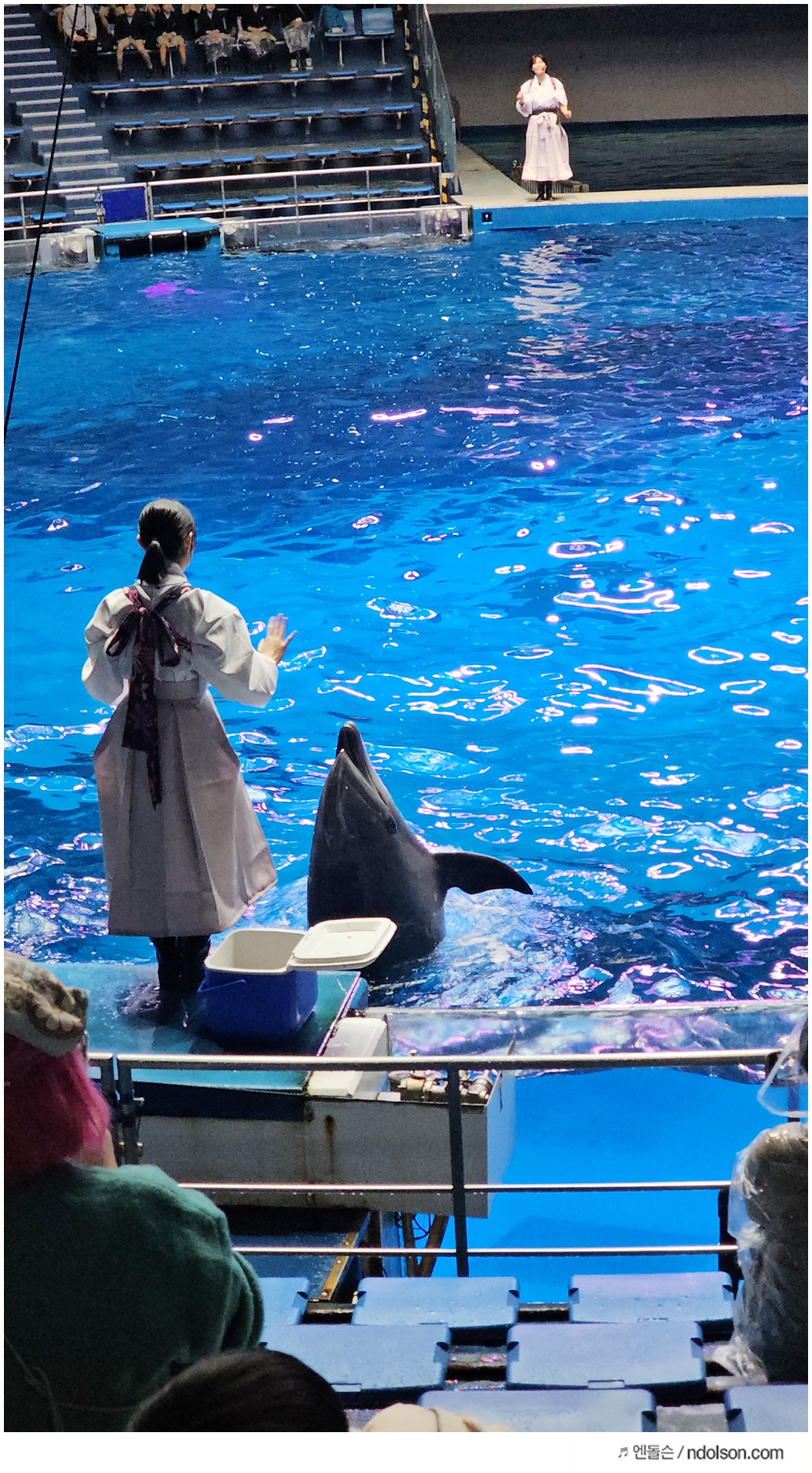 앞줄에서 관람하면 돌고래가 점프할 때마다 물이 튀어 다들 물벼락을 맞지만, 이 또한 웃음이 끊이지 않는 즐거운 경험이었습니다. 그래서 앉을 때 앞에 5줄이후부터 앉아아 물벼락을 않맞습니다. 그래서 우비를 파는데, 유치원생들은 물벼락 맞으려고 우비 입고 왔더라고요.