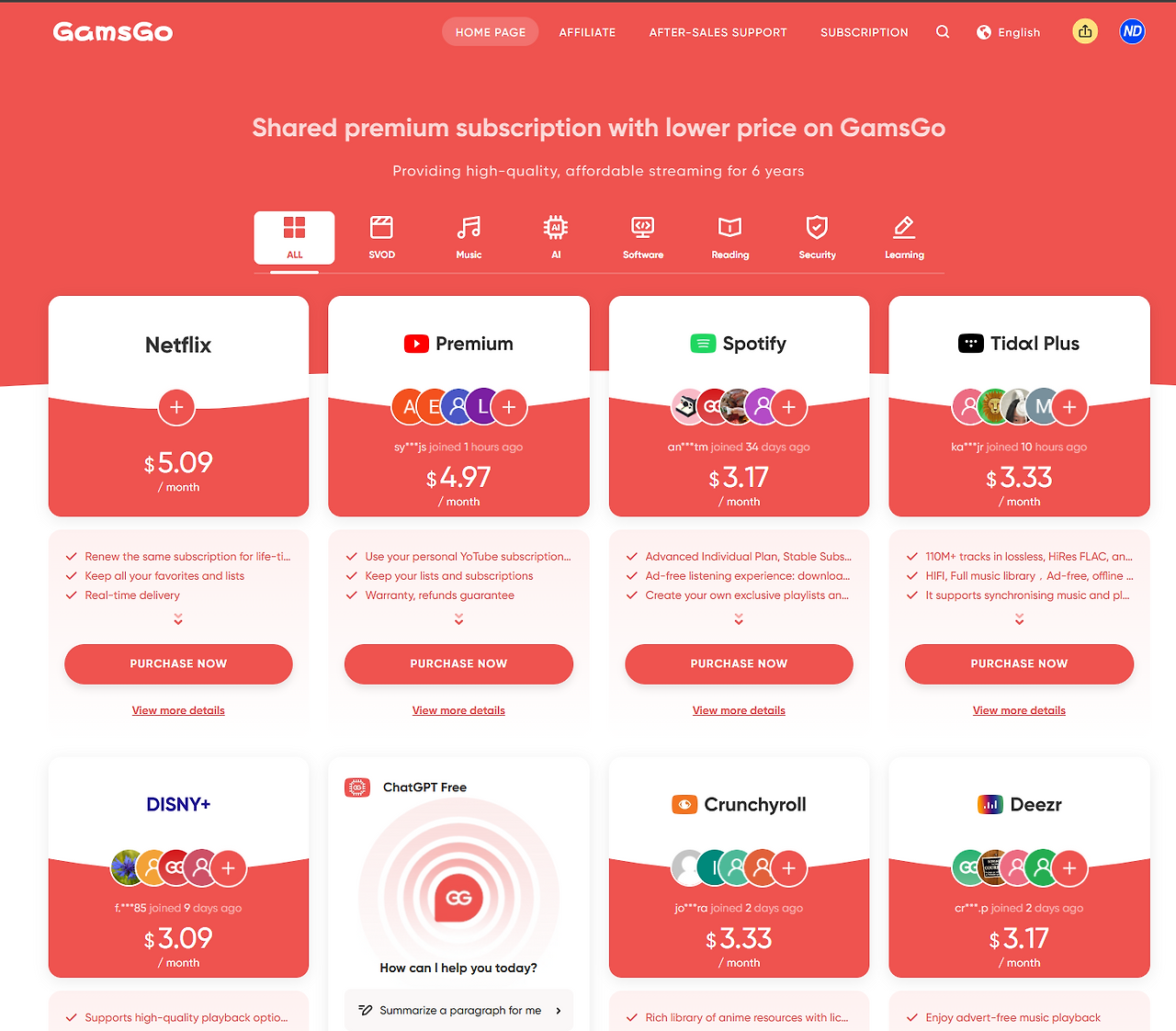 겜스고에서는 넷플릭스, 디즈니+ 같은 다양한 구독 서비스도 저렴하게 제공하고 있어 한꺼번에 여러 서비스를 저렴하게 이용할 수 있다는 장점이 있습니다. 프로모션 코드를 활용하면 챗GPT 플러스는 물론 다른 서비스도 할인된 가격으로 구독할 수 있습니다.