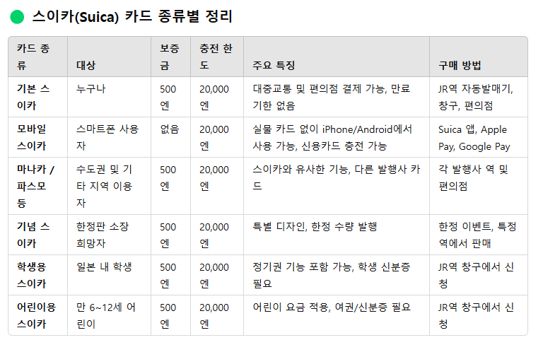 스이카 카드란? 스이카 카드는 일본 JR 동일본에서 발행한 교통카드로, 도쿄 및 수도권 지역에서 주로 사용됩니다. 지하철, 버스뿐만 아니라 편의점, 자판기, 식당 등에서도 사용할 수 있어 현금을 꺼낼 필요 없이 간편하게 결제가 가능합니다.