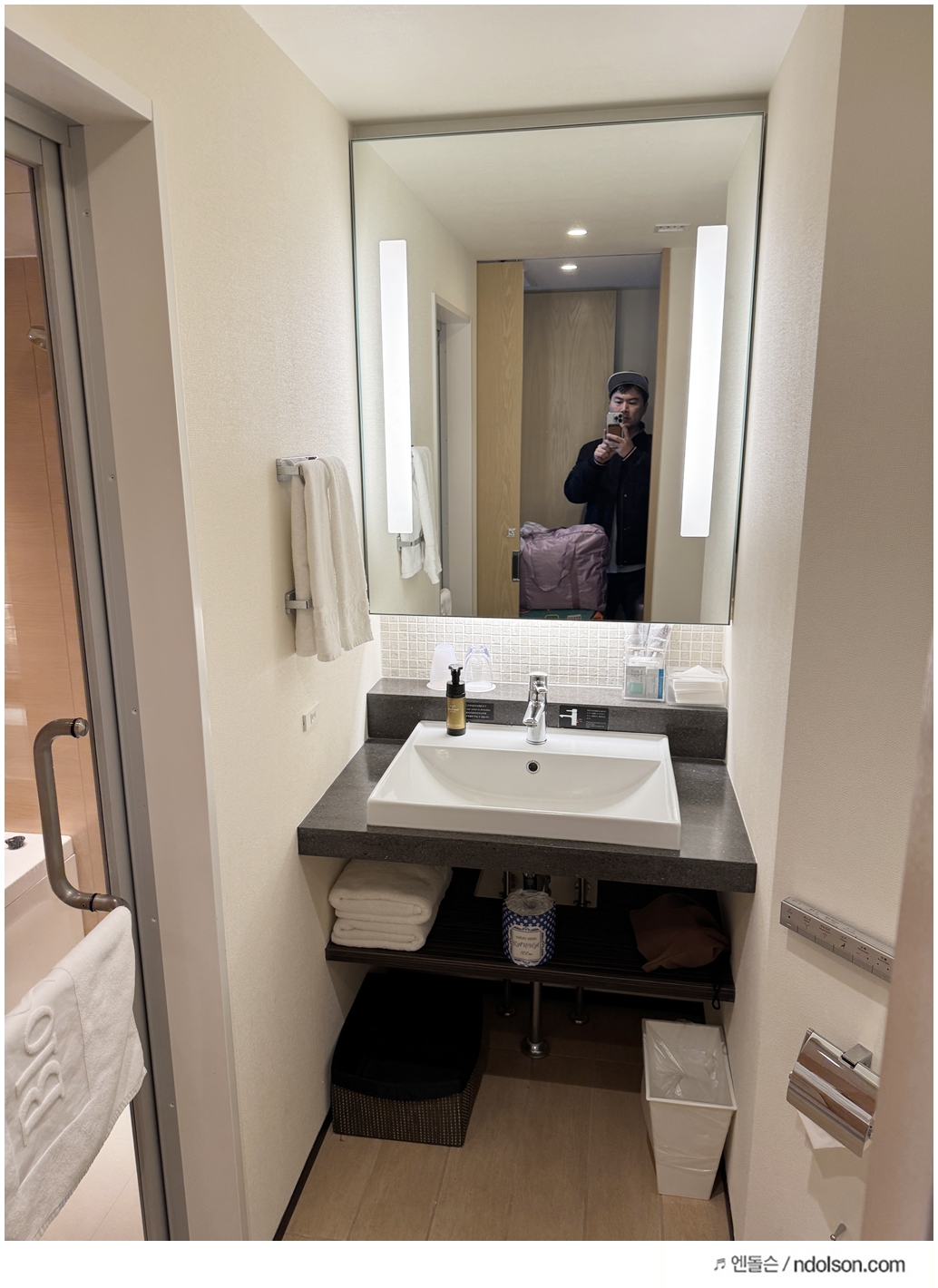 객실은 일본 호텔 치고는 넉넉한 편이었습니다. 16층 슈페리어 트윈룸(1602호)에 묵었는데, 28인치 캐리어 3개를 펼쳐도 공간이 충분할 정도로 넓었습니다. 화장실과 욕조도 커서 아이와 함께 사용하기 편리했습니다.