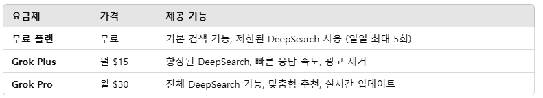 무료 플랜은 기본적인 검색 기능을 제공하지만, DeepSearch의 사용이 제한적이며 검색 속도가 상대적으로 느릴 수 있습니다. 또한, 무료 플랜에서는 DeepSearch 기능을 하루 5회까지만 사용할 수 있는 제한이 있습니다. 반면, 유료 플랜(Grok Plus, Grok Pro)은 DeepSearch 기능이 강화되며, 더 빠르고 정밀한 검색 결과를 제공합니다.