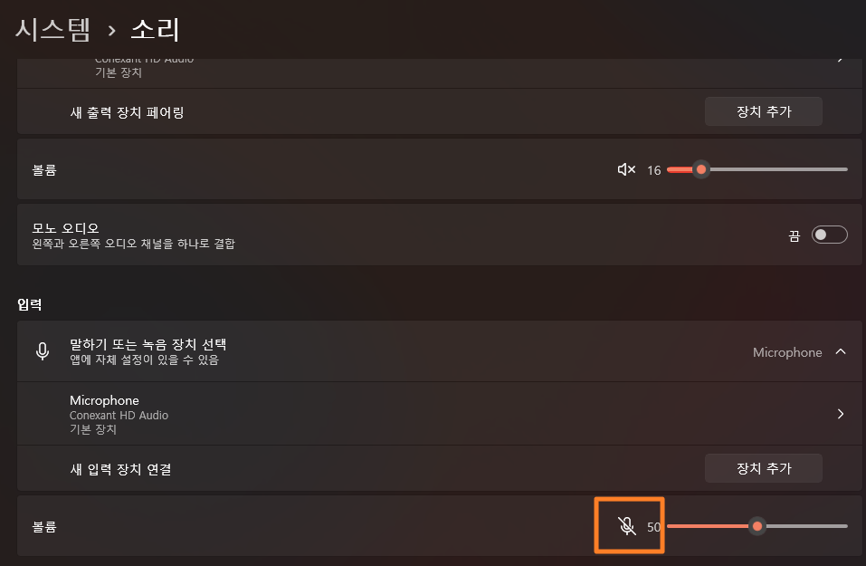 4. 윈도우 사운드 설정에서 마이크 음소거 해제