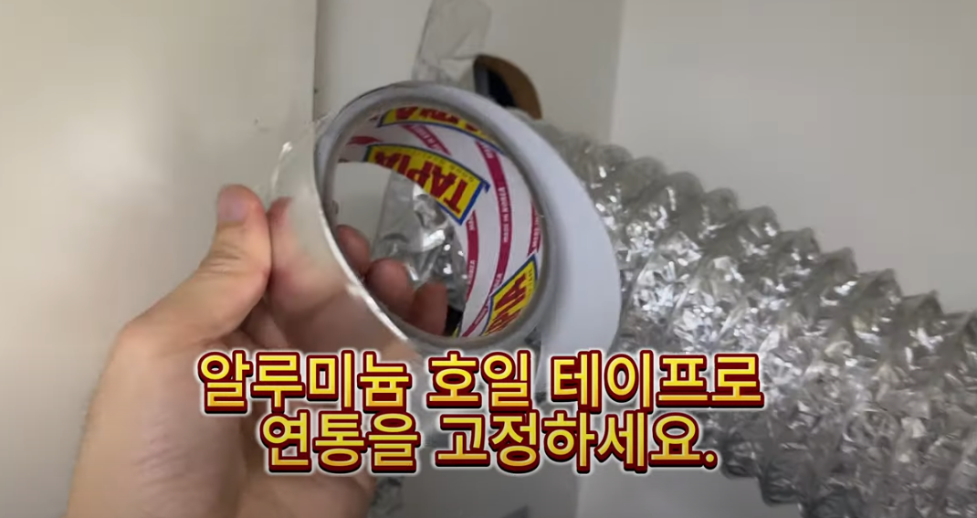 - 연통 연결 작업을 진행합니다. 알루미늄 테이프를 이용해 공기 누출이 없도록 단단히 감아줍니다.