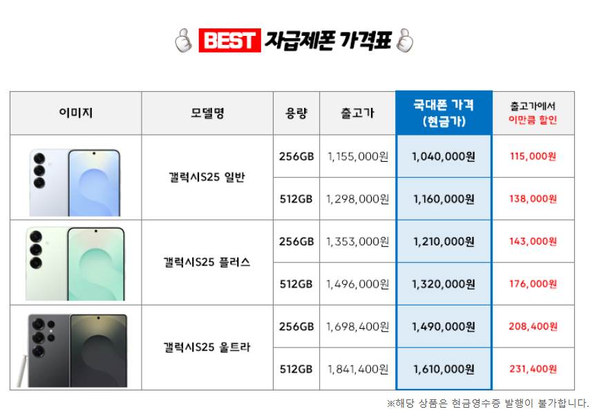 - 갤럭시S25 일반 모델 (256GB) 출고가는 1,155,000원이지만, 국대폰 가격은 1,040,000원으로 115,000원 할인