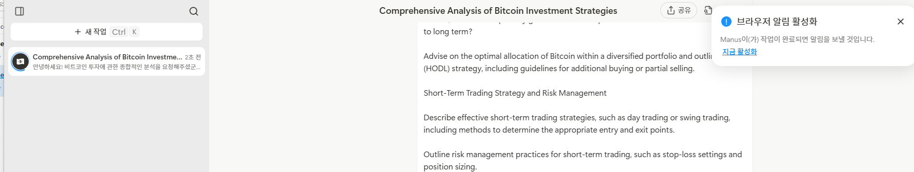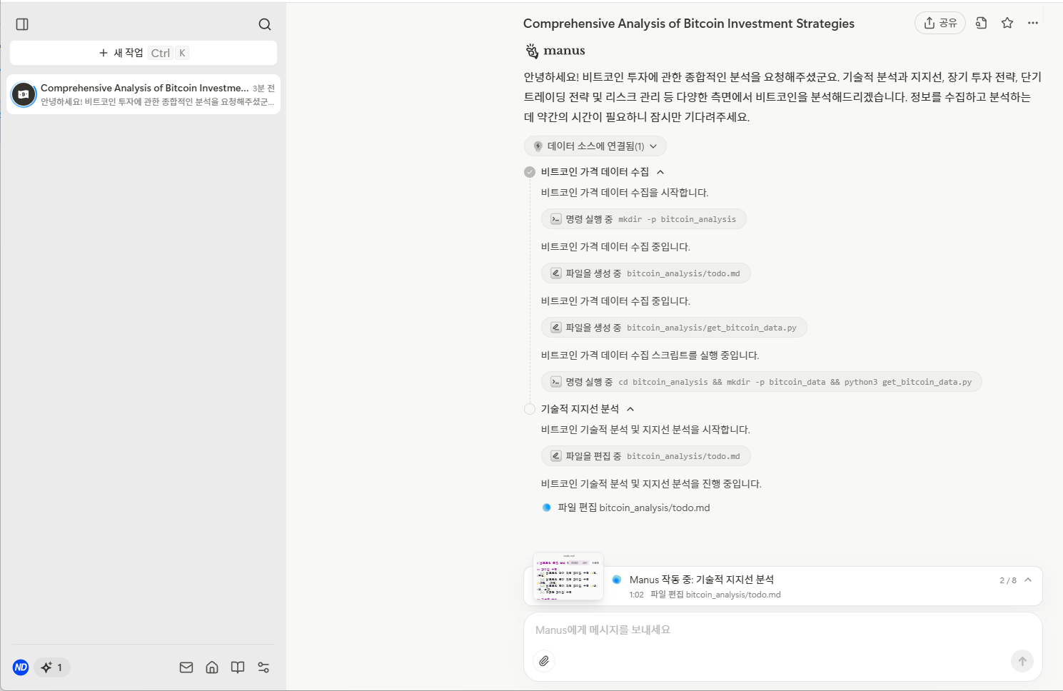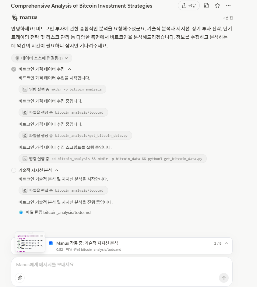 비트코인에 대해서 전망을 조사하라고 명령했습니다. 한국어 명령도 가능하지만 영어 명령을 만들었습니다.