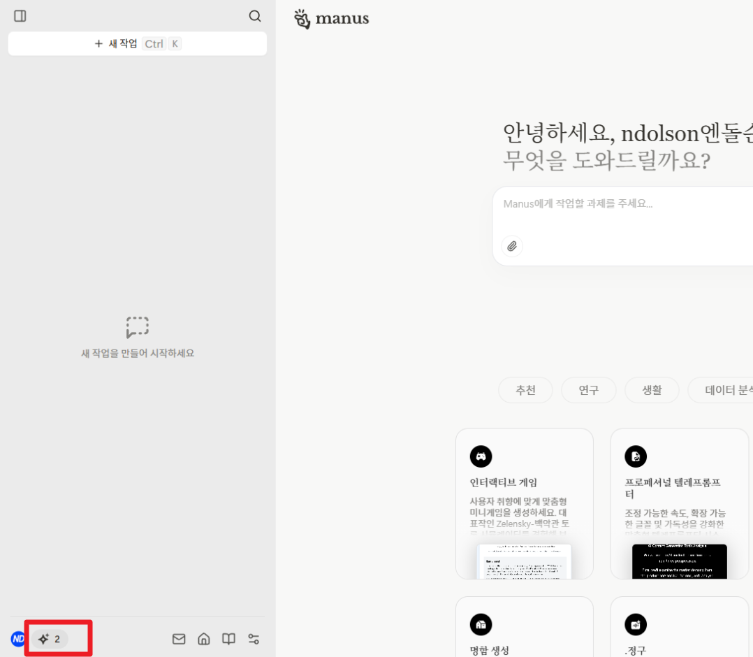 Manus AI는 하루에 두 번 무료로 사용할 수 있는 데일리 크레딧 2회를 제공합니다. 왼쪽 하단에 표시됩니다.