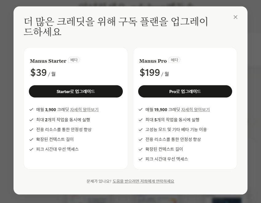 마누스 AI 에이전트의 요금입니다. 베타로 무료로 이용하고 있지만, 3개까지만 가능하네요.