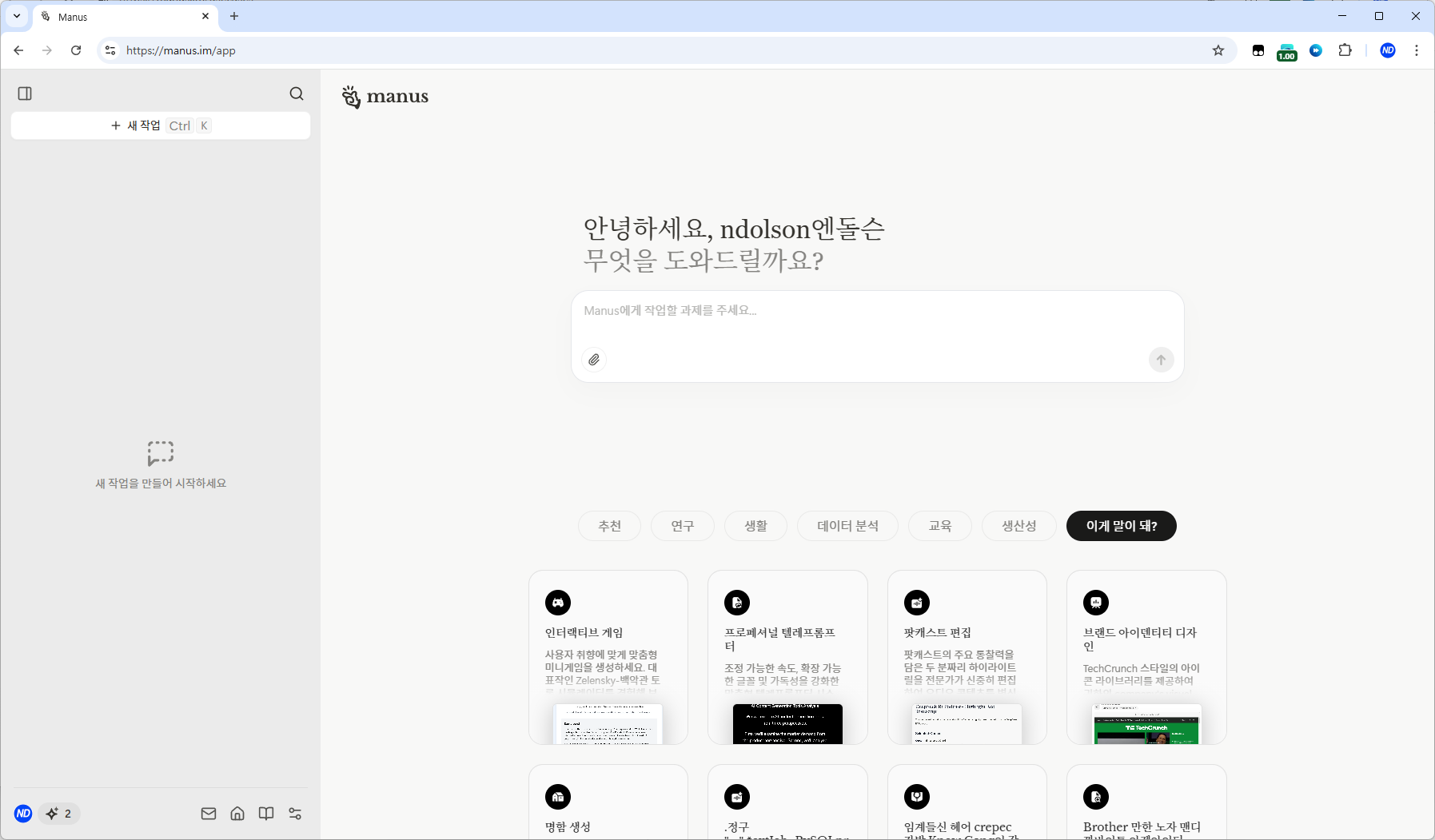 Manus AI는 하루에 두 번 무료로 사용할 수 있는 데일리 크레딧 2회를 제공합니다. 왼쪽 하단에 표시됩니다.