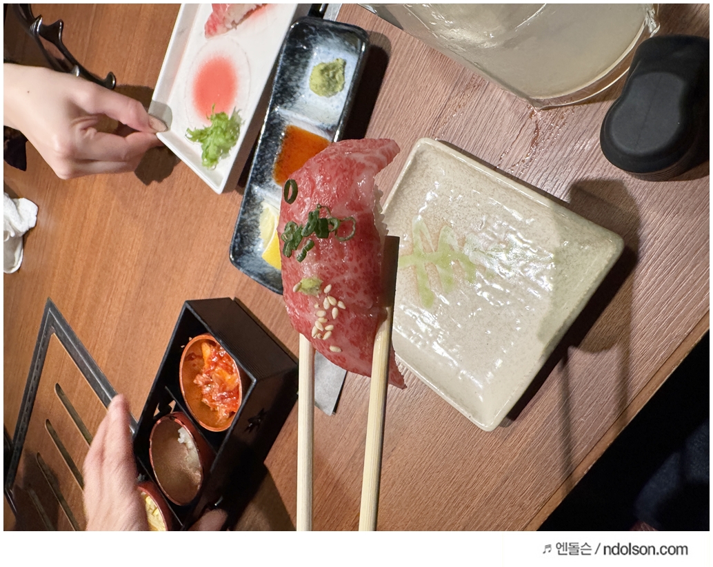 고기 외에도 식사에 함께 나온 반찬과 소스류도 인상 깊었습니다. 마늘과 숙주볶음, 김치, 무절임 등 간단한 반찬이 함께 제공되었으며, 와사비 소금, 간장 소스, 유자 소스 등 다양한 소스를 선택해 고기와 조합할 수 있었습니다.