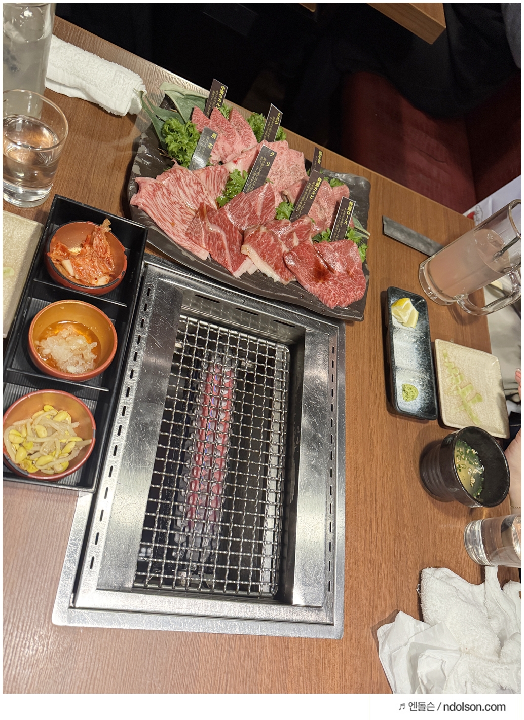 식사는 세련된 분위기의 테이블에서 시작됐습니다. 자리에는 중앙에 숯불 그릴이 자리잡고 있었고, 다양한 고기 부위가 정갈하게 플레이팅된 접시가 등장하면서 본격적인 야끼니꾸가 시작되었습니다.
