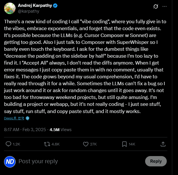 2020년대 중반, AI의 발전과 함께 소프트웨어 개발 방식에도 급격한 변화의 바람이 불고 있습니다. 특히 Andrej Karpathy가 명명한 "Vibe 코딩(Vibe Coding)"이라는 개념은 단순한 유행을 넘어, 기존의 코딩 방식과는 질적으로 다른 새로운 흐름을 만들어가고 있습니다.
