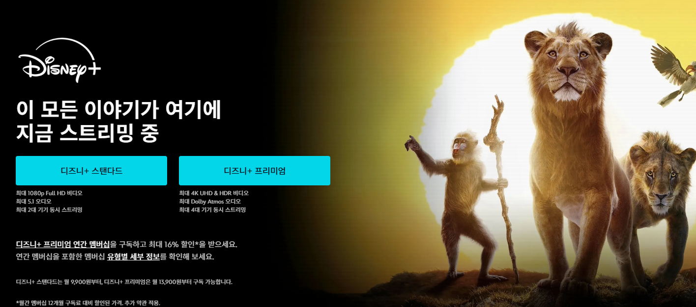디즈니 플러스는 두 가지 요금제를 운영하고 있습니다. 각 요금제는 해상도, 동시 접속 가능 수, 가격 측면에서 차이를 보입니다.