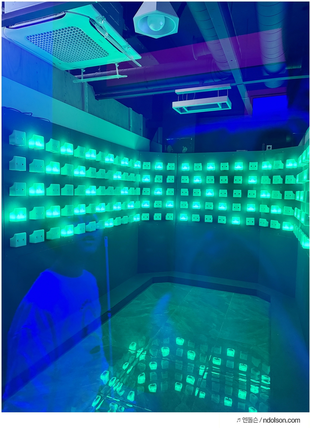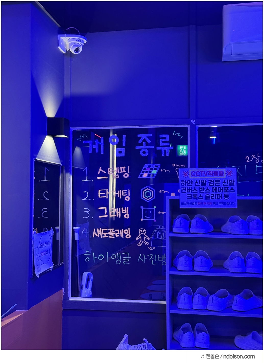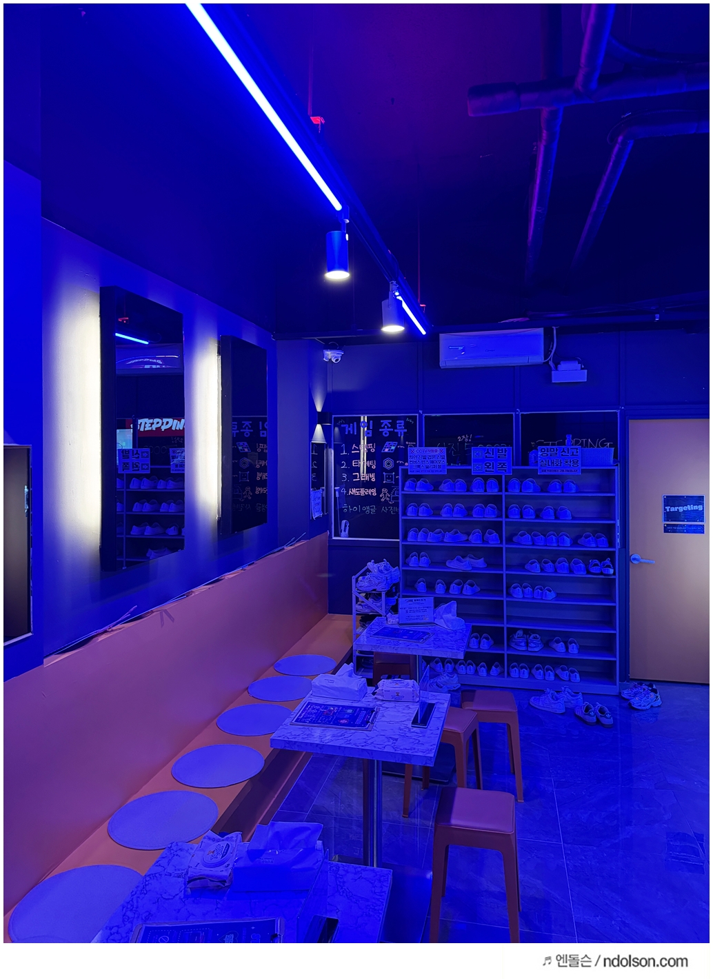 스텝핑 내부는 마치 클럽처럼 어두운 조명과 신나는 분위기였습니다. 실내 온도도 시원하게 유지되어 있어 격렬한 활동에도 부담이 없습니다. 입장 후에는 캐비닛에 짐을 넣고, 제공된 신발로 갈아신은 후 대기 공간에서 잠시 쉴 수 있습니다.