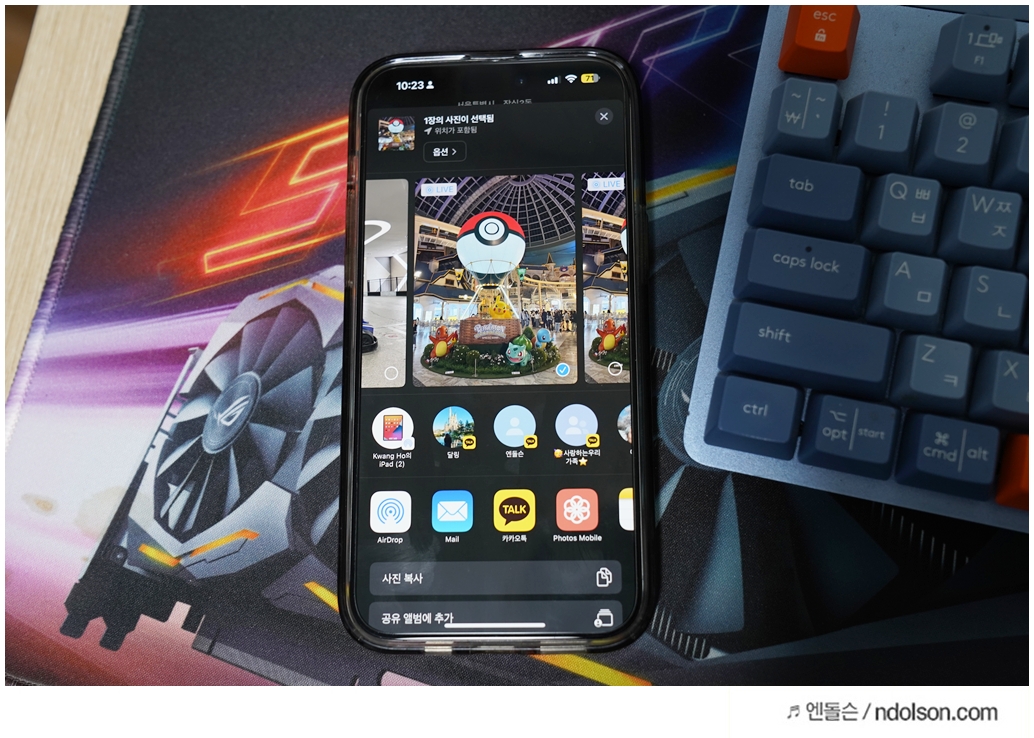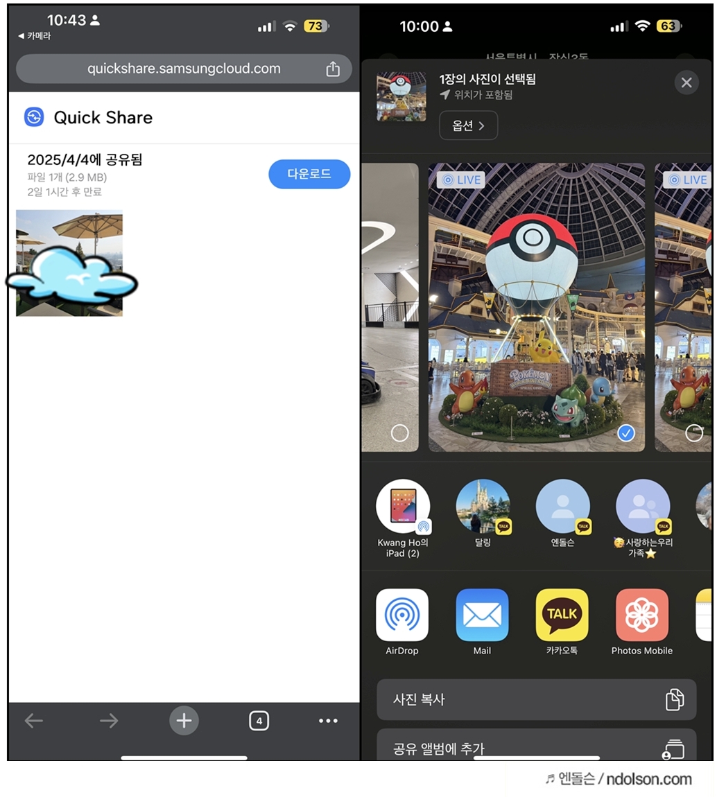 아이폰과 갤럭시는 퀵쉐어로 공유하면 되고요. 아이폰끼리는 쉽게 에어드롭 하시면 됩니다.