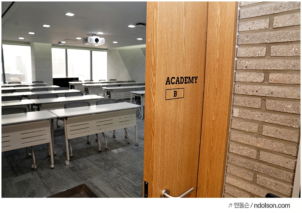 강의실도 있는데요. 40명 정도 수용할 수 있는 공간으로 회사 세미나나 강의를 진행할 수 있게 준비되어 있습니다. 강의실에는 빔프로젝터와 음향시설, 사회자 전용 데스크가 설치되어 있고 전문적인 강의가 가능한 공간입니다. 또 강의실 이용자들을 위해 별도로 전용 라운지를 구비하고 있어, 강의실을 이용하는 사람, 업무를 보는 사람의 동선이 겹치지 않아 교육, 세미나 등 활동을 쾌적하게, 집중해 진행할 수 있을 것 같습니다.