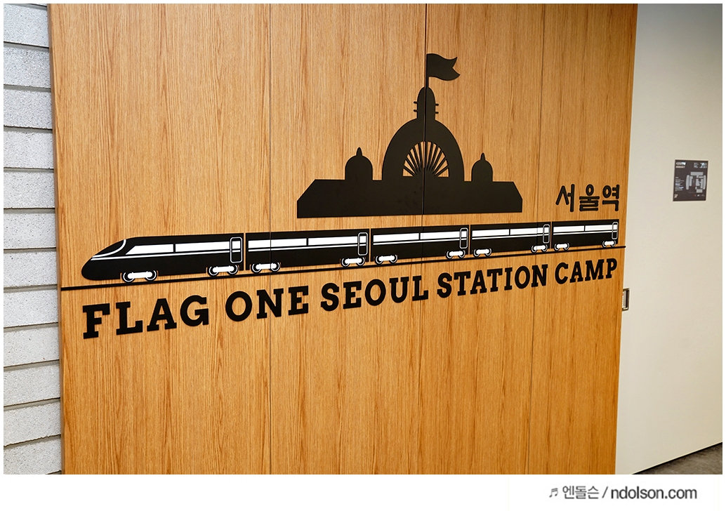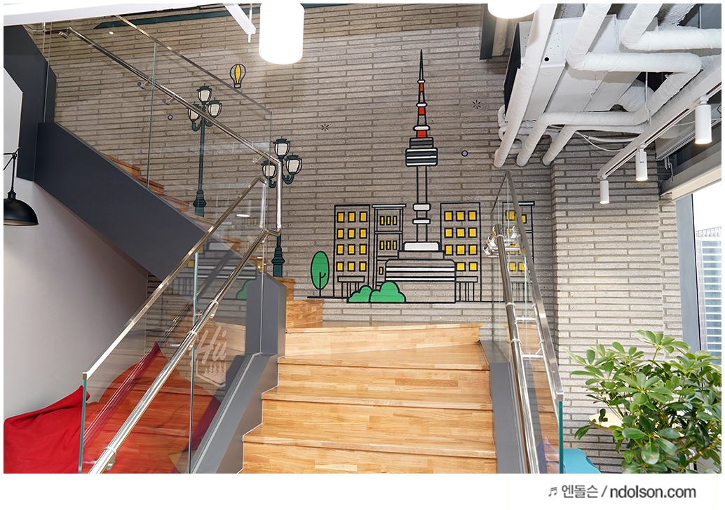 서울역 플래그원 캠프는 17층, 18층으로 되어 있습니다. 18층으로 올라가는 계단은 서울N타워를 연상시키는 그림과 서울역 그림을 재미를 주었습니다.