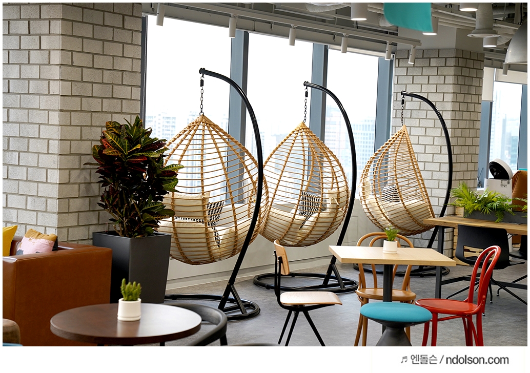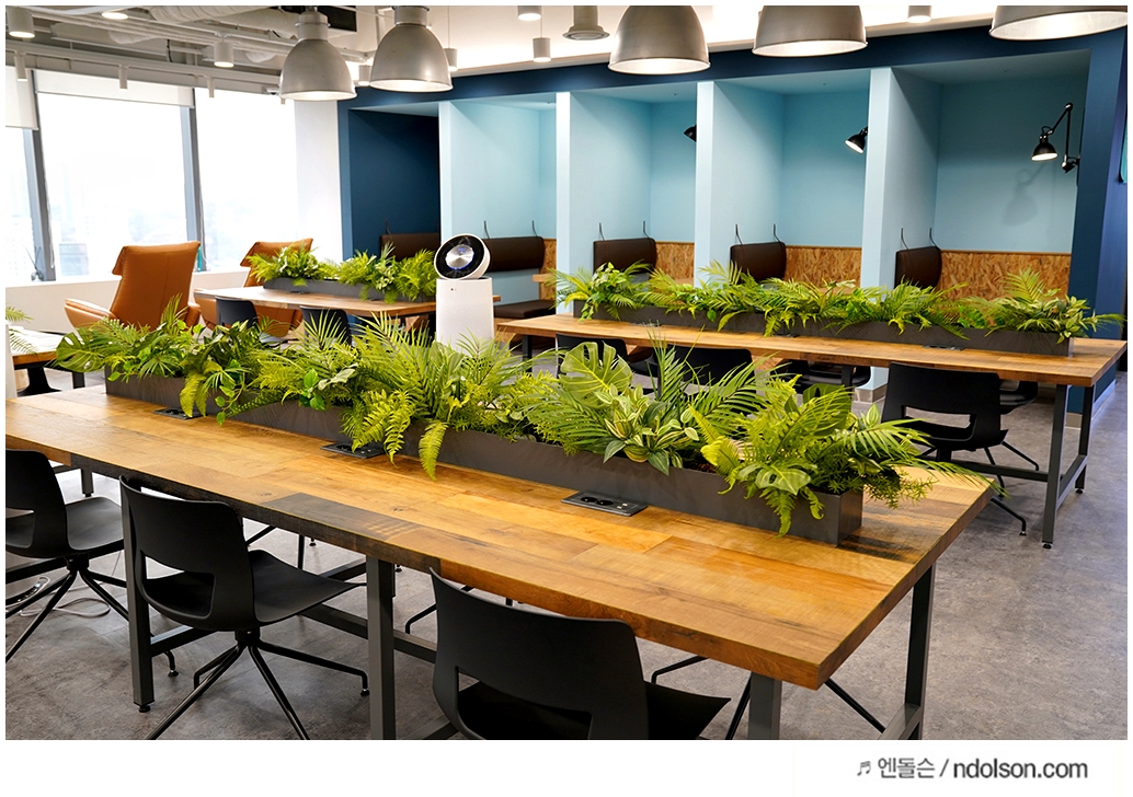 라운지에는 노트북을 가지고 자유롭게 회사 업무를 할 수 있는 공간인데요. 업무 스트레스를 받은 것도 여기서는 다 풀 수 있을 것 같습니다. LG 퓨리케어 360도 공기청정기가 곳곳에 있어서 상쾌한 공기 상태를 만들어 주고, 화분 등이 놓여 있어 기분까지 상쾌한 환경을 보여줍니다.