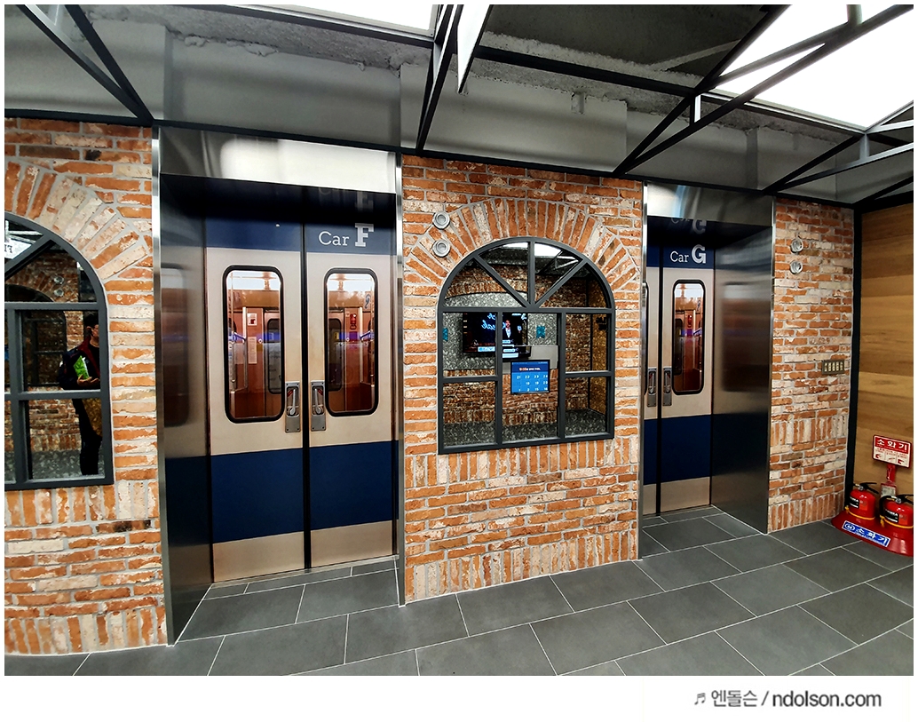 서울역의 스테이션을 연상하는 독특하고 매력적인 느낌의 엘리베이터를 타고 올라왔습니다.
