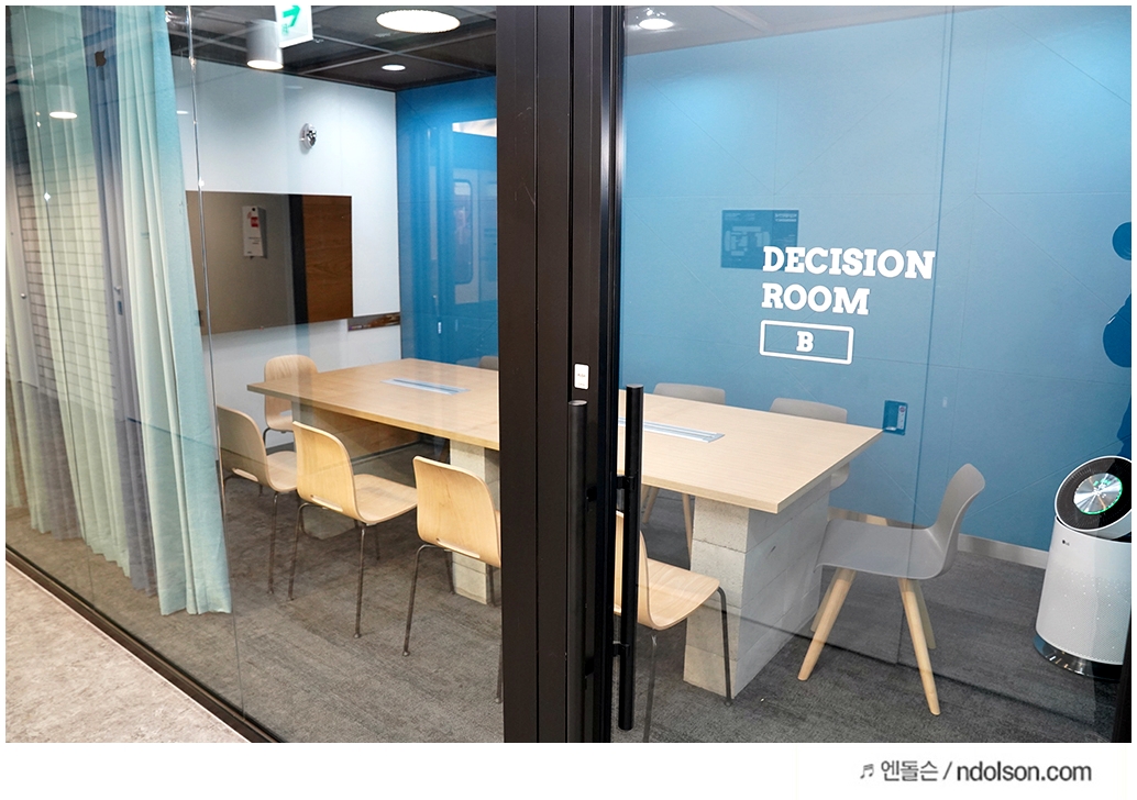 미팅룸도 위치하고 있습니다. A, B, C에 따라 수용할 수 있는 인원이 다릅니다. 또 TV와 공기청정기가 모두 비치되어 있어 쾌적한 회의실 분위기를 만들어 주는데요. 회의 중 밖에서 볼 수 없게 커튼을 쳐서 진행할 수도 있게 배려되어 있습니다.