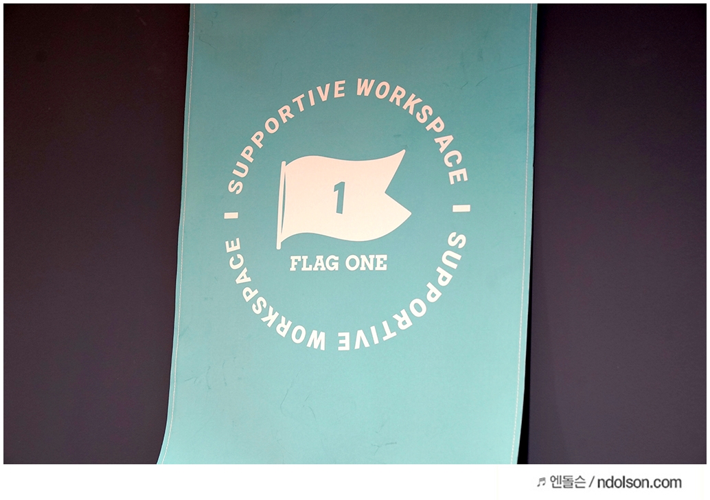 플래그원은 일의 방향과 동력을 잃지 않고 목표에 도달하도록 돕는 서포티브 워크스페이스라고 말하는데요, 그렇기 때문에 열정, 도전, 성취를 대변하는 깃발이 공간 곳곳에 보여 무언가 큰 의지가 되는 문구처럼 느끼게 되었습니다.