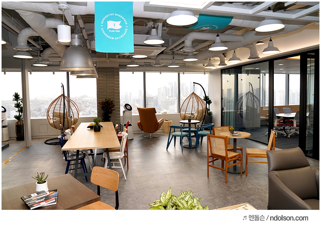 유명 카페의 느낌의 세련된 인테리어와 스트레스 없이 아이디어가 마구 솟구칠 것 같은 자유로운 분위기가 너무 잘 어울려져 있었습니다. 입주자를 위한 웰컴데스크가 위치하고 있으며 매니저가 상주하고 있습니다. 플래그원의 아이덴티티를 느낄 수 있는 인테리어와 자유분방하면서 세련된 감성을 잘 느낄 수 있는 분위기를 보여주었습니다.