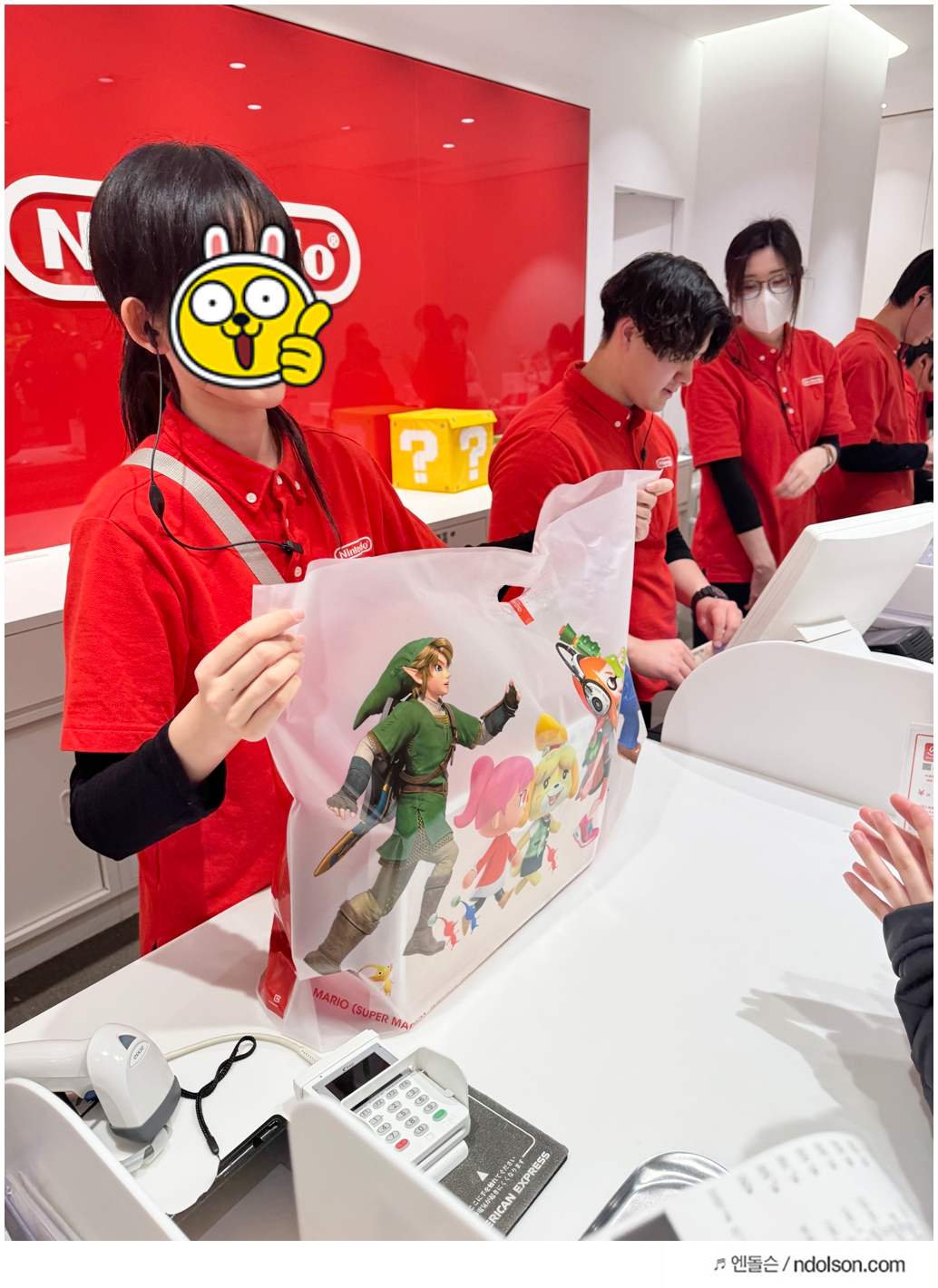 아쉽게도 젤다 관련 제일복권은 품절이었지만, 마리오 복권은 일부 남아 있었습니다. 그리고 최종 계산대에서는 정리한 굿즈들을 담고 닌텐도 포인트 적립까지 깔끔하게 완료했습니다.