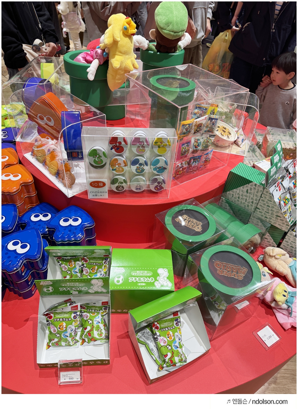 입구에서는 대형 마리오 조형물이 반겨주며 스토어의 시작을 알렸고, 루이지, 요시 인형도 한쪽을 장식하고 있었습니다. 그리고 바로 목적지였던 젤다 존으로 직진! 게임 속 ‘츄츄젤리’가 실제 젤리로 나와 있었고, 굿즈는 다음과 같이 다양했습니다: