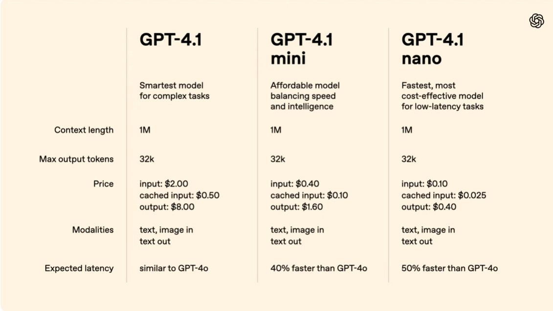 - API 전용 모델로 GPT-4.1, Mini, Nano 세 가지 버전이 출시되었으며, 챗GPT에는 아직 통합되지 않았습니다.