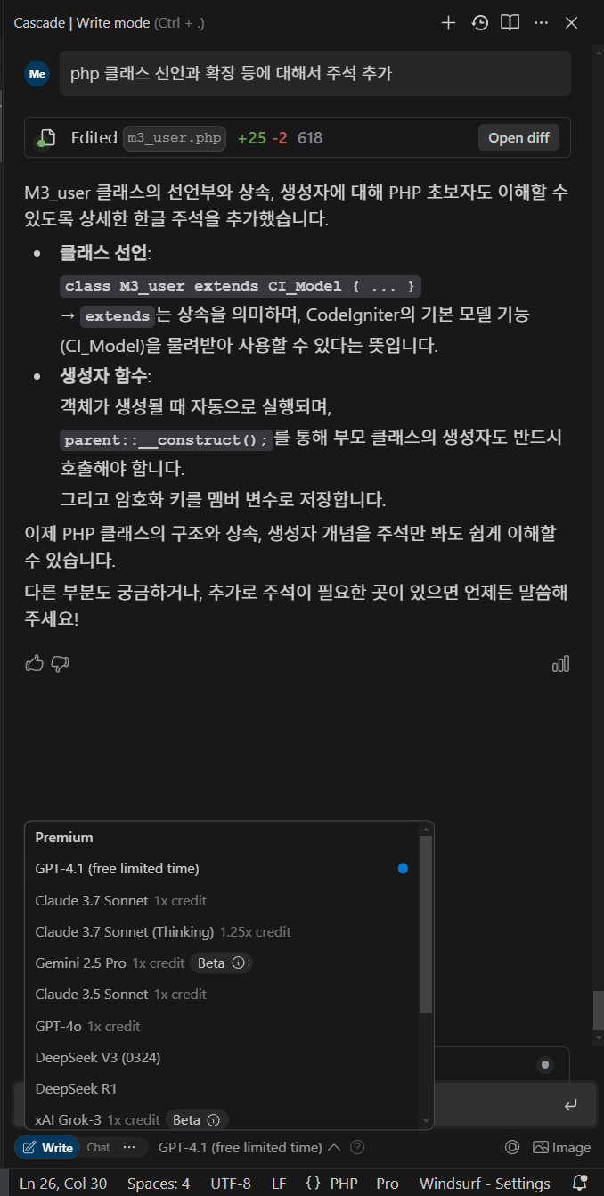 Windsurf AI에서 API를 통해 직접 GPT-4.1을 사용해본 결과, 응답 속도는 GPT-4o 대비 확실히 빠르고, 코드 작성 정확도도 향상된 것을 느낄 수 있었습니다. 자동완성 기능이 더욱 자연스럽고, 문서 생성 시 구조와 형식을 일정하게 유지하는 점이 돋보였습니다. 특히 대규모 프로젝트에서 복잡한 로직 처리나 API 문서화 등에서 실용적인 도움을 받았습니다.