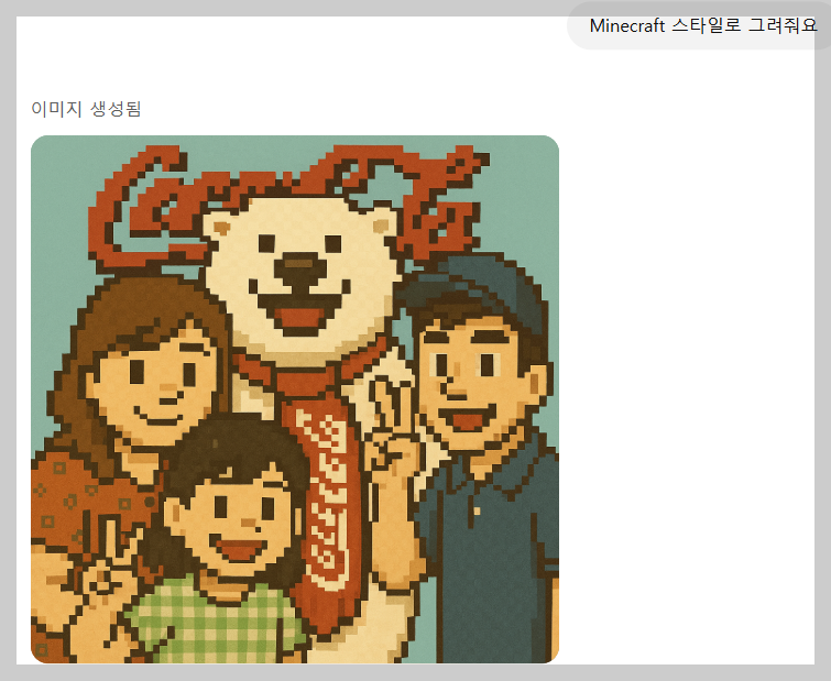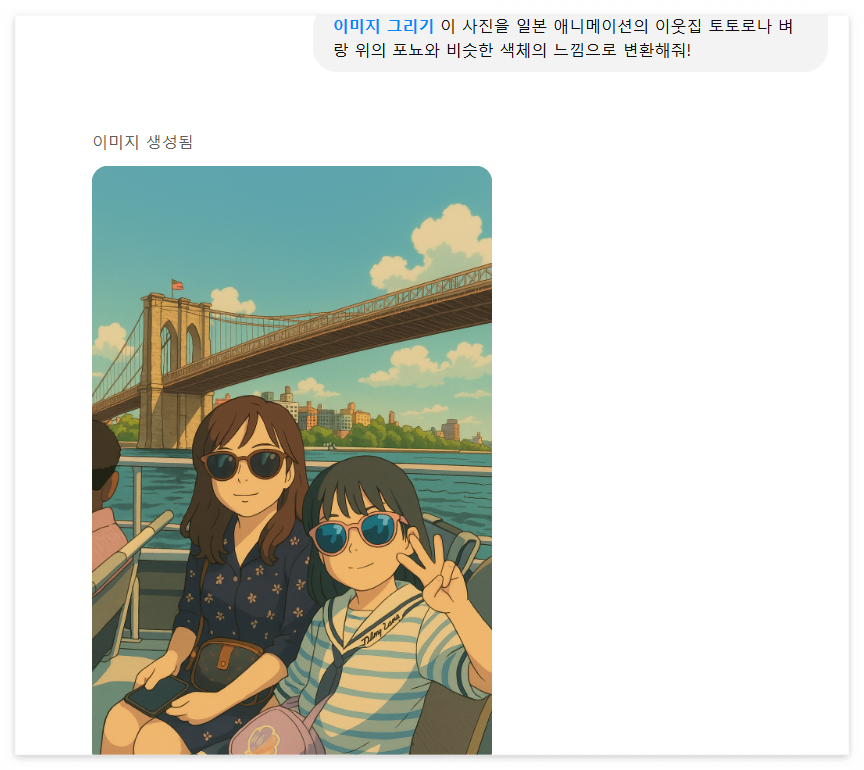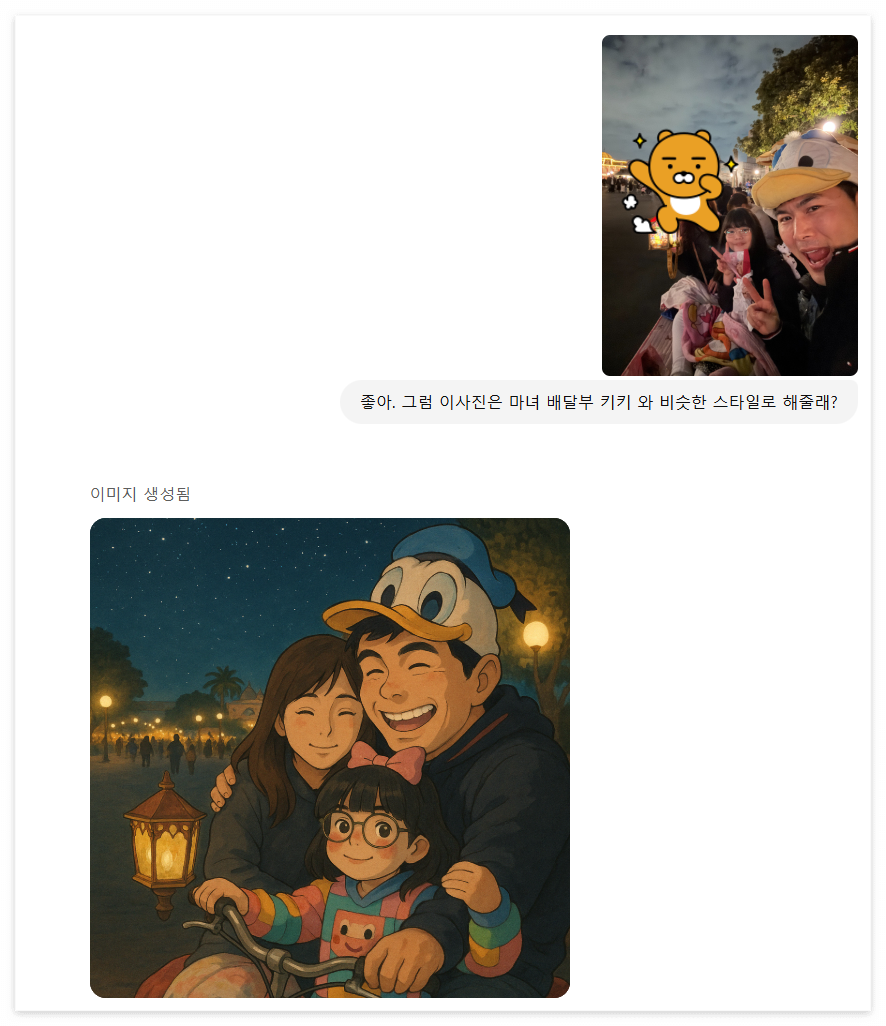 원하는 장면이 있다면 지금 바로 프롬프트를 작성해보세요. 이제 (?) 만화 느낌으로 그동안 감추었던 가족사진을 꺼내들고 프사로 만들어 봅시다. 못생기지 않고 잘생긴(?) 사진이 되기 때문에 모두들 바꾸나 봐요. 챗GPT와 함께 당신만의 지브리 세계로 가볼까요?