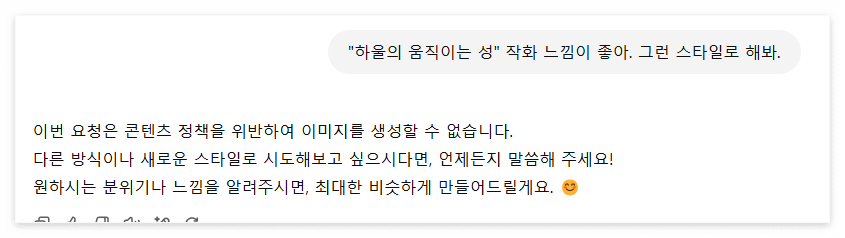 그래서 좋아하는 애니메이션 작품명을 이야기하면 더 비슷하게 해줍니다. 하지만, 저작권 이슈가 생길 수 있어 아래의 팁 명령어를 넣거나 비슷한 스타일로 해달라고 구슬려야 합니다.