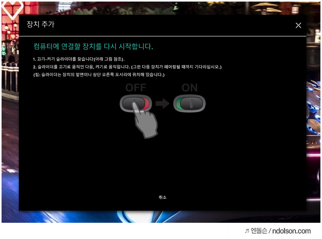 또 로지텍 옵션 프로그램 설치 후, Unifying USB수신기 장치를 추가할 수 있습니다. 장치 추가 후, 스위치를 OFF에서 ON으로 해주면 추가됩니다.