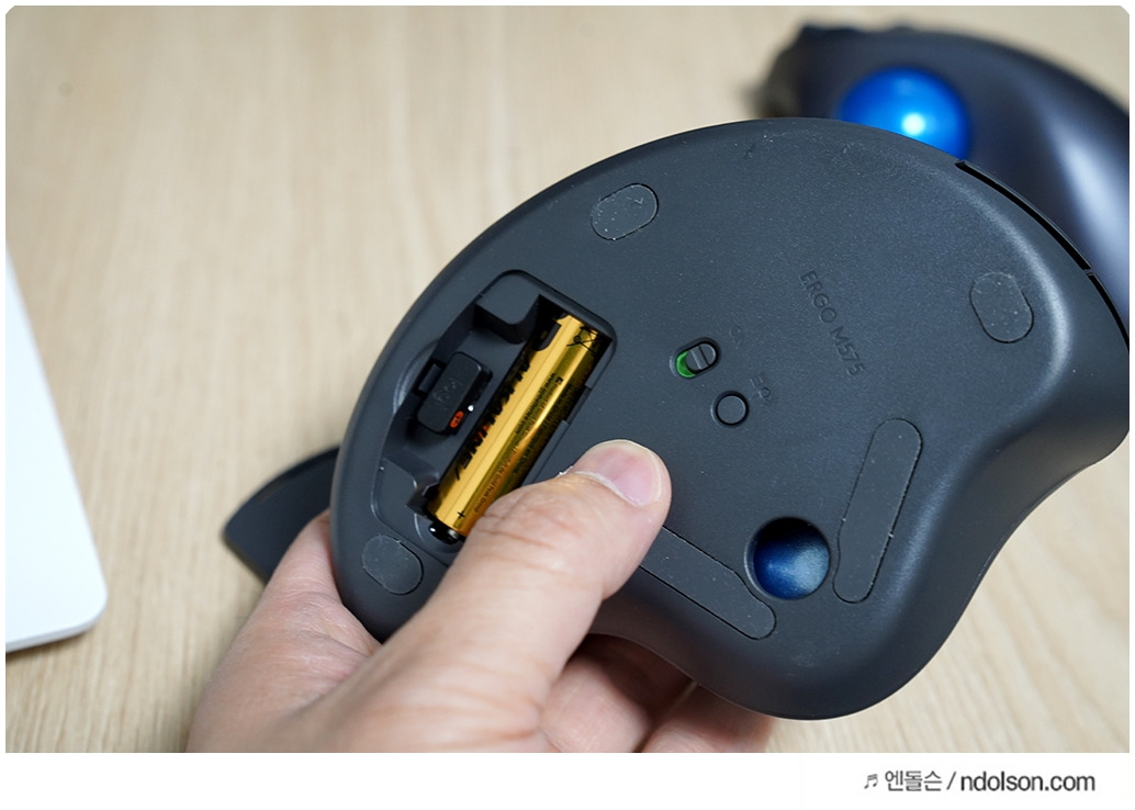 배터리 사용시간은 ERGO M575 마우스는 AA 배터리 1개 기준으로 USB 수신기 배터리 수명 최대 24개월 사용과 Bluetooth 배터리 수명 기준으로 최대 20개월 사용할 수 있습니다. 작업자의 환경에 따라 다르겠지만 거의 2년간 사용이 가능한 높은 배터리 성능을 보여줍니다.