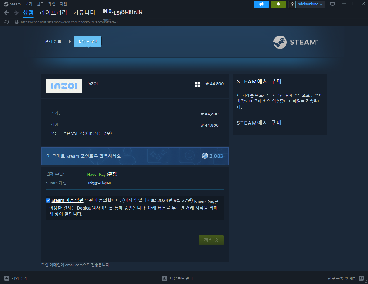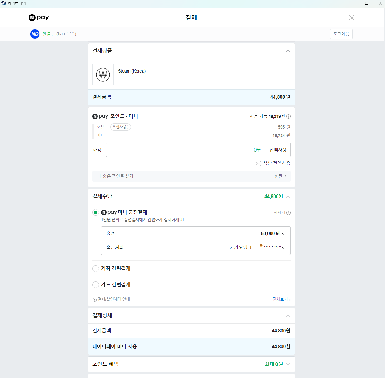 스팀 결재는 신용카드나 카카오페이, 네이버페이가 지원되었습니다.