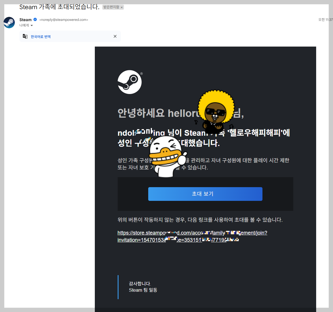 구매 후 딸아이와 함께 인조이 게임을 즐기기 위해 스팀의 가족 공유 기능을 활용했습니다. 스팀에서는 한 계정에서 구매한 게임을 가족 구성원끼리 공유할 수 있는 기능을 제공합니다. 이 기능을 통해 별도의 추가 비용 없이 가족 모두가 게임을 즐길 수 있습니다.