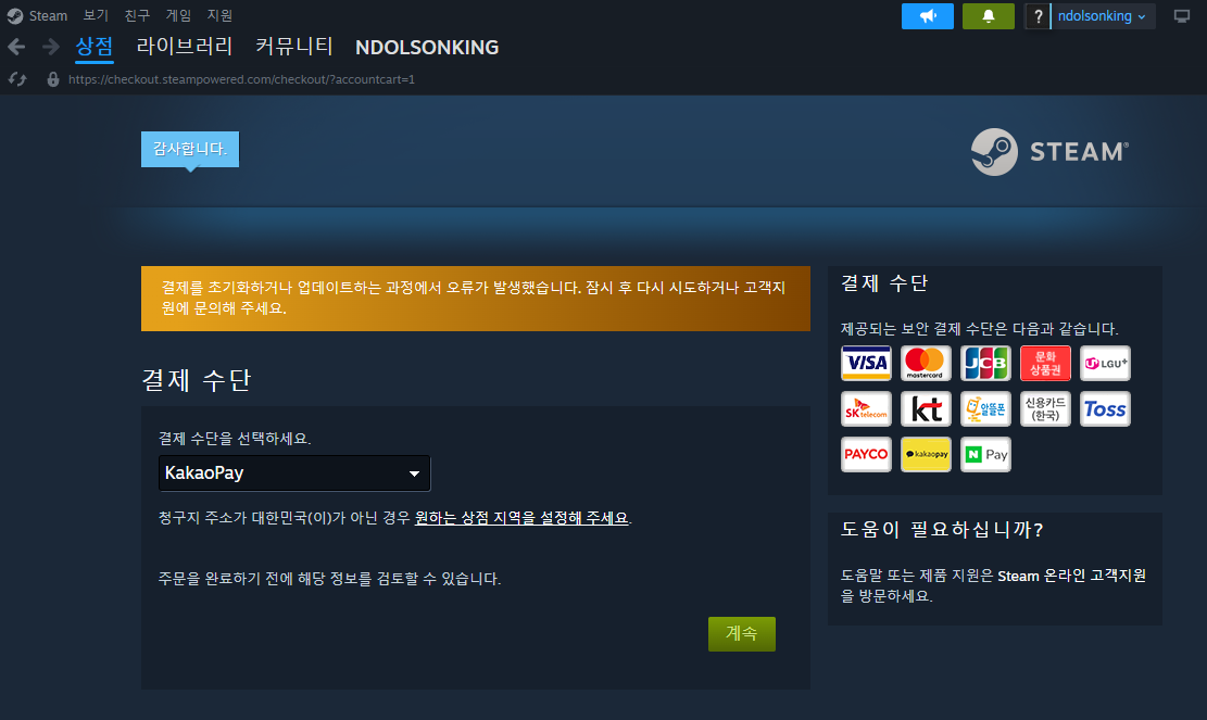 스팀 결재는 신용카드나 카카오페이, 네이버페이가 지원되었습니다.