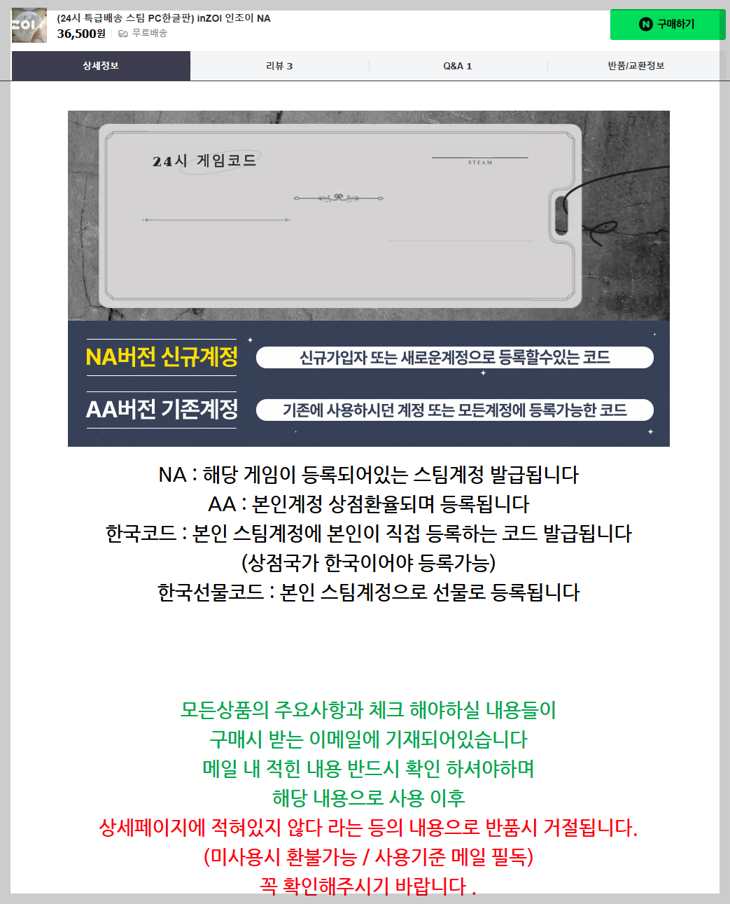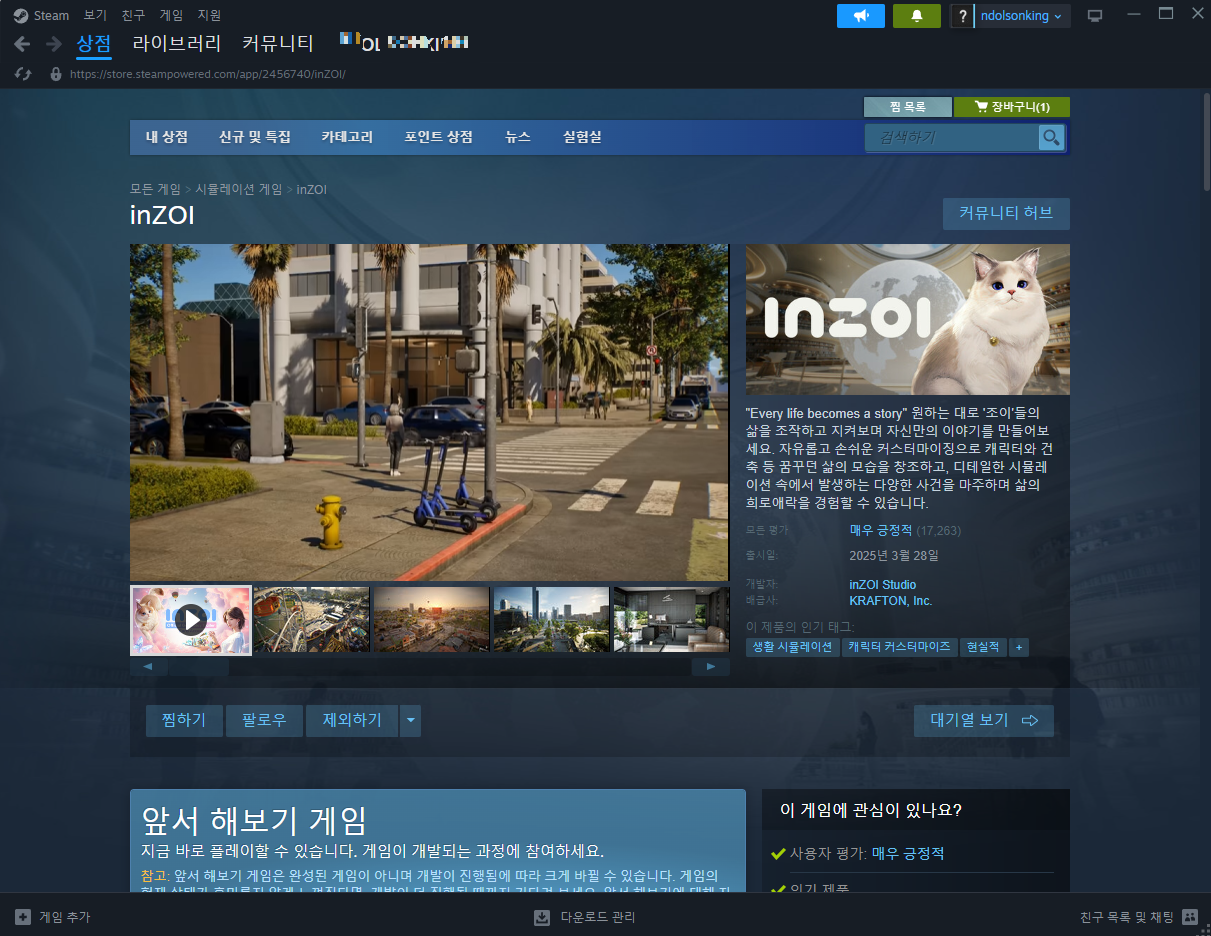네이버에서 저렴하게 구매할 수 있는 경로도 있었지만, 보안 문제와 계정 관리의 번거로움을 생각해 스팀에서 정식으로 구매했습니다. 가격 차이는 있었지만, 안전하고 편리하게 가족과 함께 인조이 게임을 즐길 수 있어 만족스럽습니다.