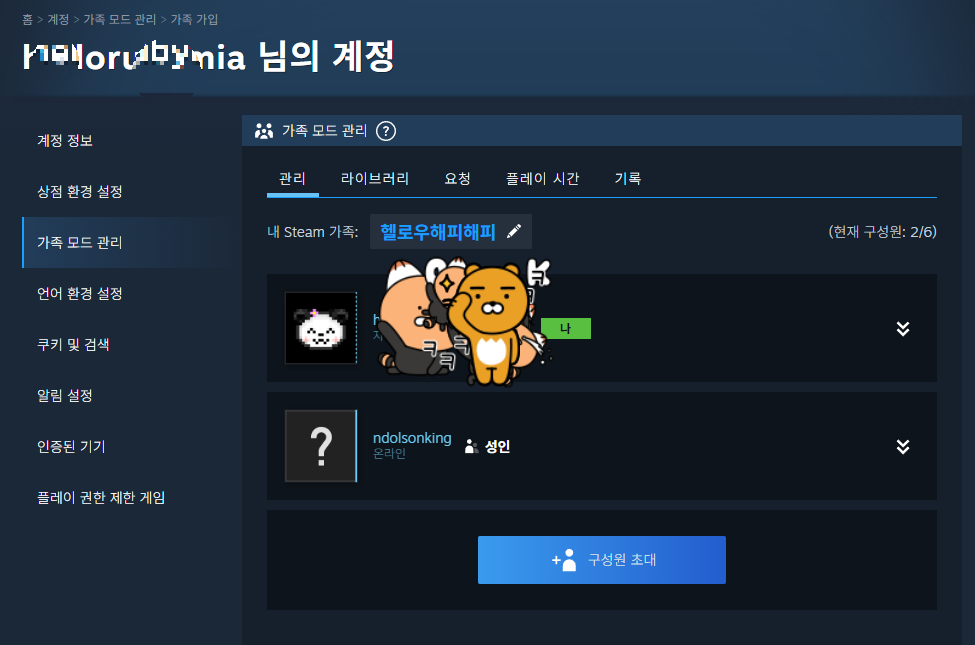 구매 후 딸아이와 함께 인조이 게임을 즐기기 위해 스팀의 가족 공유 기능을 활용했습니다. 스팀에서는 한 계정에서 구매한 게임을 가족 구성원끼리 공유할 수 있는 기능을 제공합니다. 이 기능을 통해 별도의 추가 비용 없이 가족 모두가 게임을 즐길 수 있습니다.