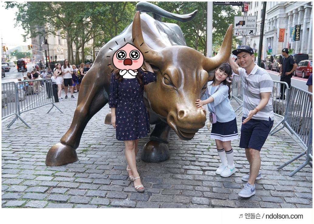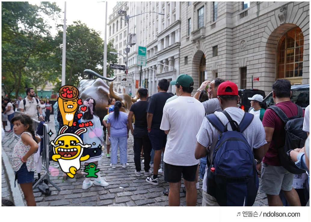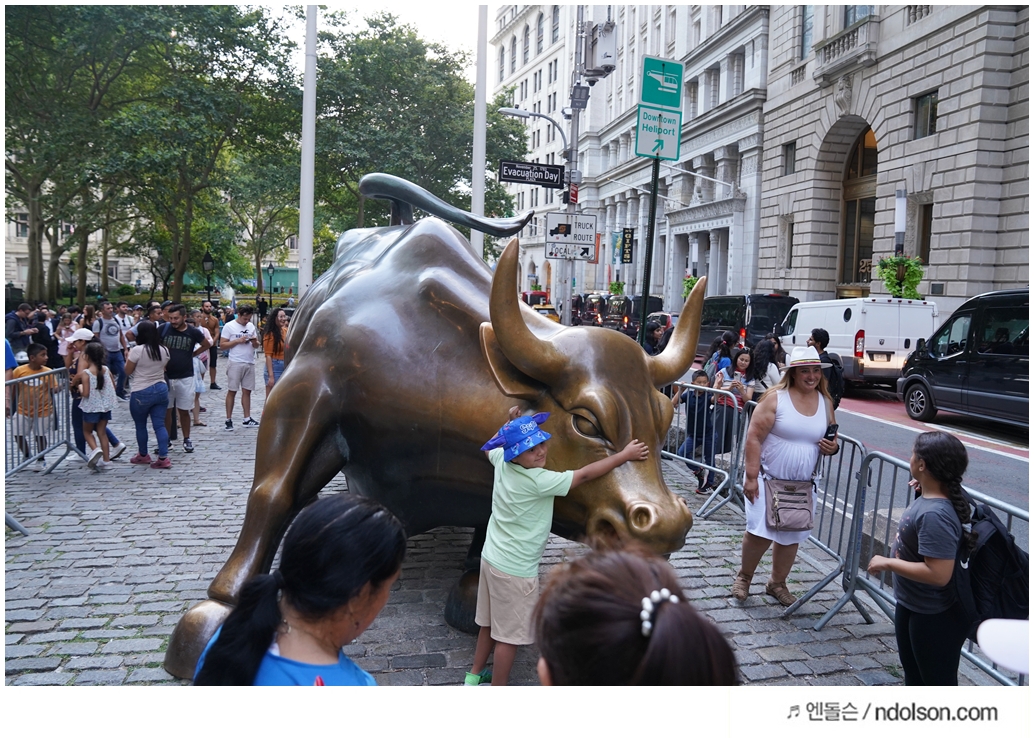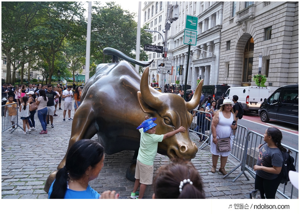 월 스트리트를 대표하는 랜드마크인 '돌진하는 황소(Charging Bull)'는 단순한 동상을 넘어 금융 시장의 상승세와 투지, 자본주의의 힘을 상징합니다. 뉴욕을 찾는 관광객이라면 누구나 이 청동 황소와 인증샷을 남기기 위해 긴 줄을 서야 하죠. 우리도 예외는 아니었습니다.