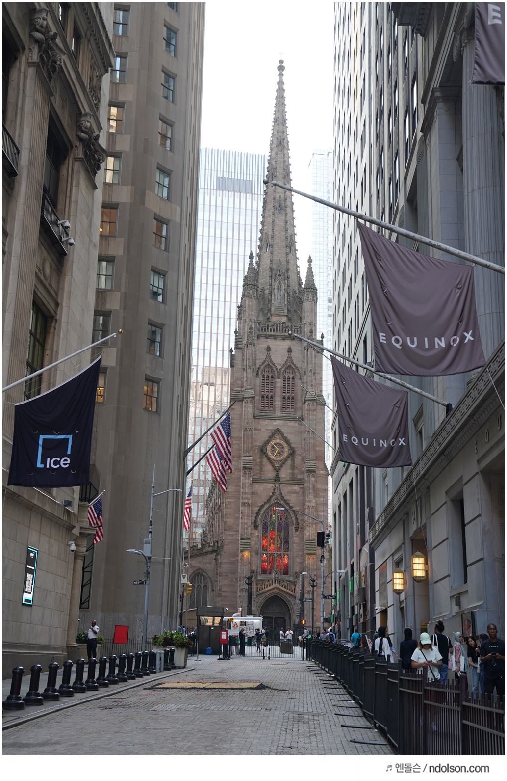 월 스트리트 중심에는 세계 최대의 증권 거래소인 뉴욕증권거래소(NYSE)가 있습니다. 거대한 국기와 함께 장식된 고전적인 건축 양식은 매일 전 세계 경제 뉴스에서 접하던 바로 그 장면이 눈앞에 펼쳐진 듯한 감동을 안겨주었습니다.