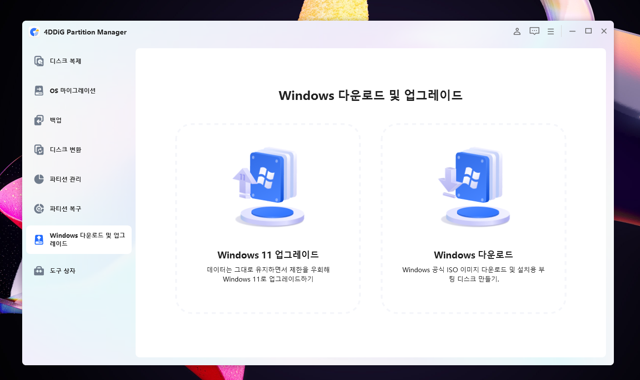4DDiG Partition Manager는 Tenorshare에서 개발한 디스크 관리 소프트웨어로, 디스크 복제, 파티션 합치기, C 드라이브 D 드라이브 옮기기, OS 마이그레이션 등 다양한 기능을 제공합니다. 특히 Windows 시스템을 사용하는 분들이라면 이 프로그램으로 복잡한 파티션 작업을 손쉽게 해결할 수 있습니다.