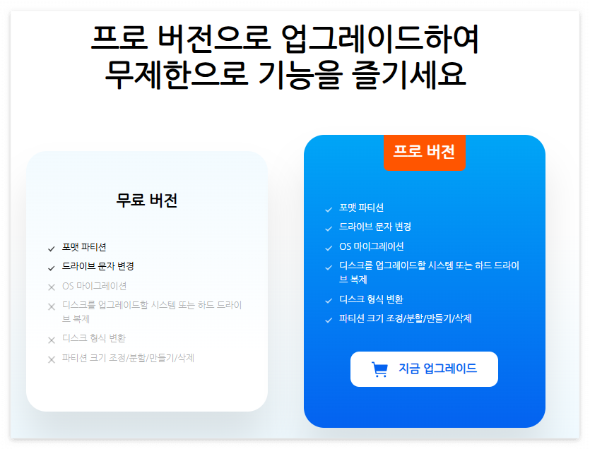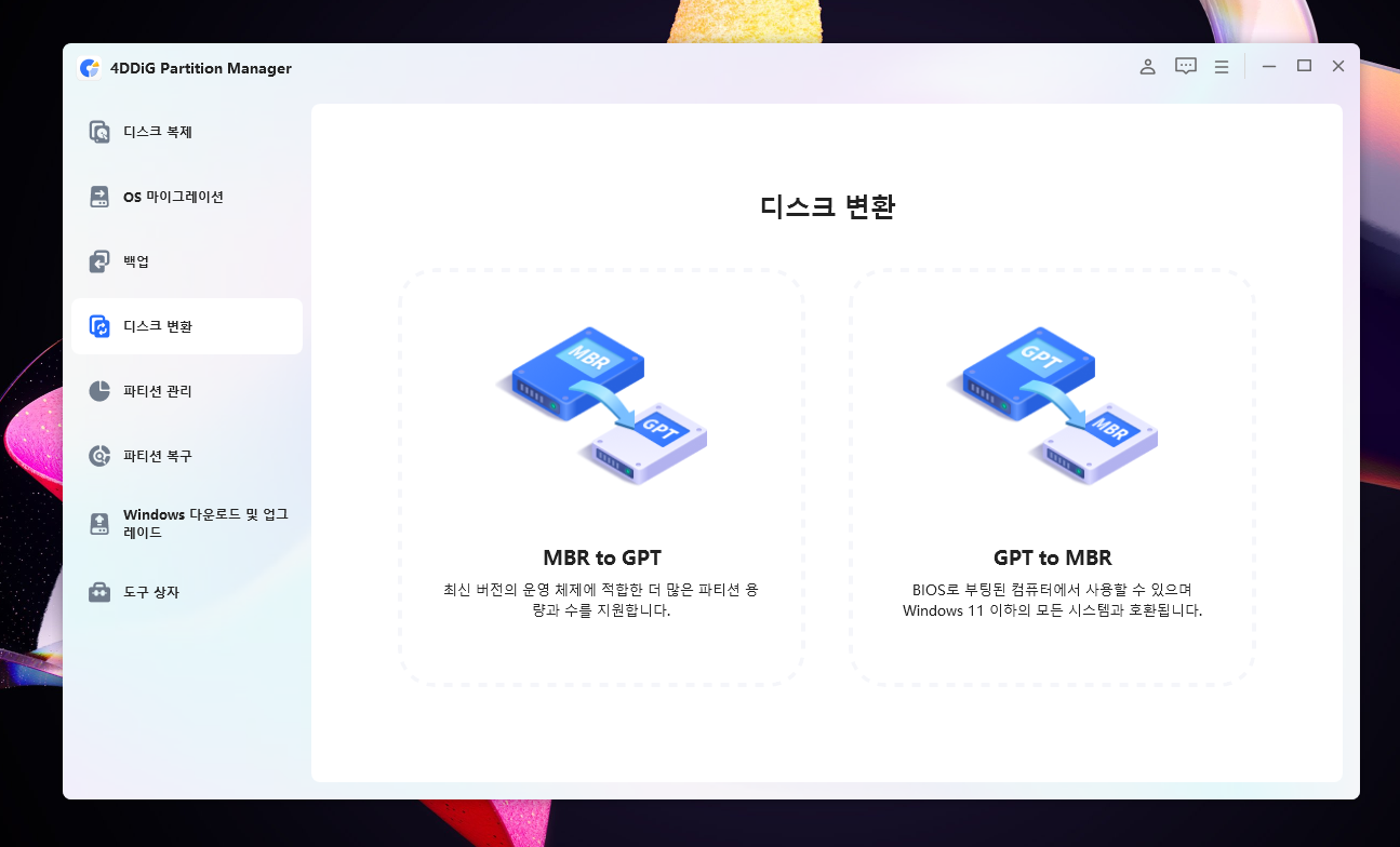 - MBR-GPT 변환: 이전 세대(MBR)와 최신(GPT) 방식 간 변환.