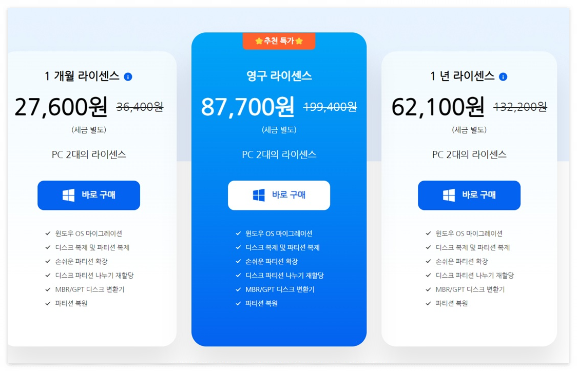 4DDiG Partition Manager는 무료체험판으로 스캔과 감지까지는 할 수 있지만, 실제 마이그레이션 및 복제 기능은 유료 버전만 사용할 수 있습니다. 필요에 따라 1개월, 1년, 영구 라이선스 중 선택해 구매하면 됩니다. 특히 SSD를 업그레이드할 계획이 있거나 C 드라이브와 D 드라이브를 합치고 싶은 분들에게는 한 번만 사용해도 충분히 본전을 뽑을 수 있는 프로그램입니다.