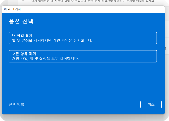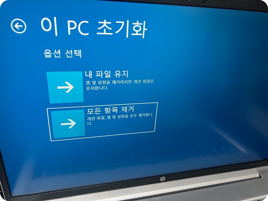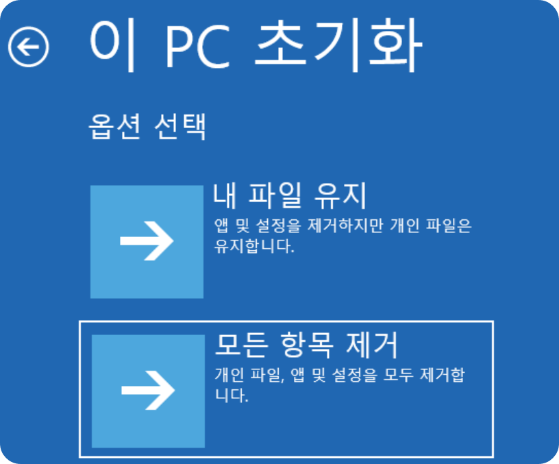 옵션 선택: '내 파일 유지' 또는 '모두 제거' 중 선택합니다. 완전한 공장초기화를 원한다면 '모두 제거'를 선택하세요.