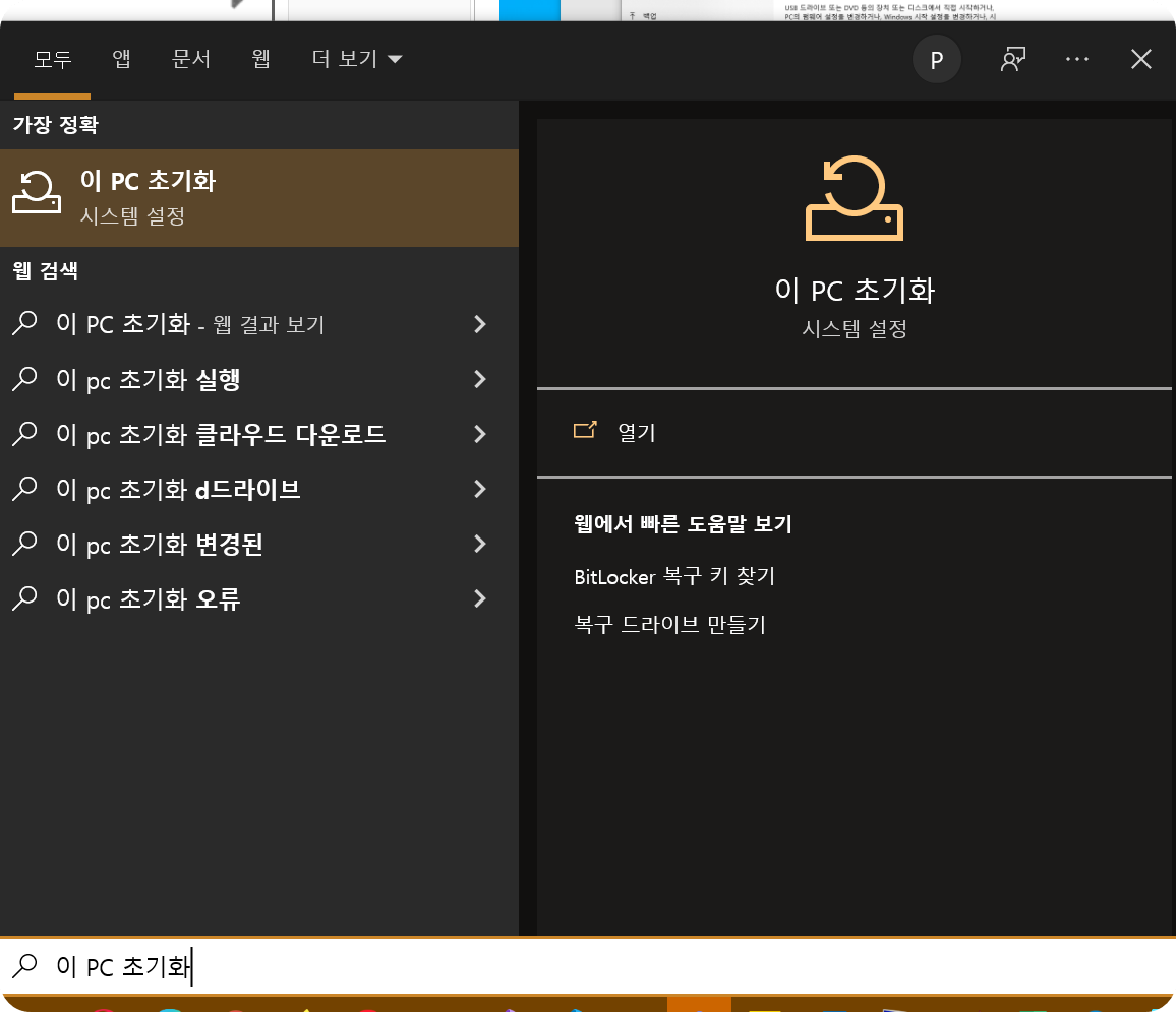위의 영상을 참고해서 윈도우 초기화 하시면 됩니다. 문제는 데이터 백업이 필요한 경우 입니다.