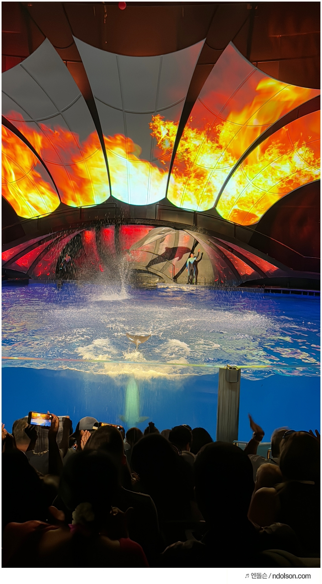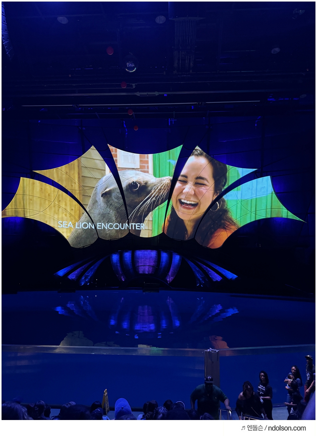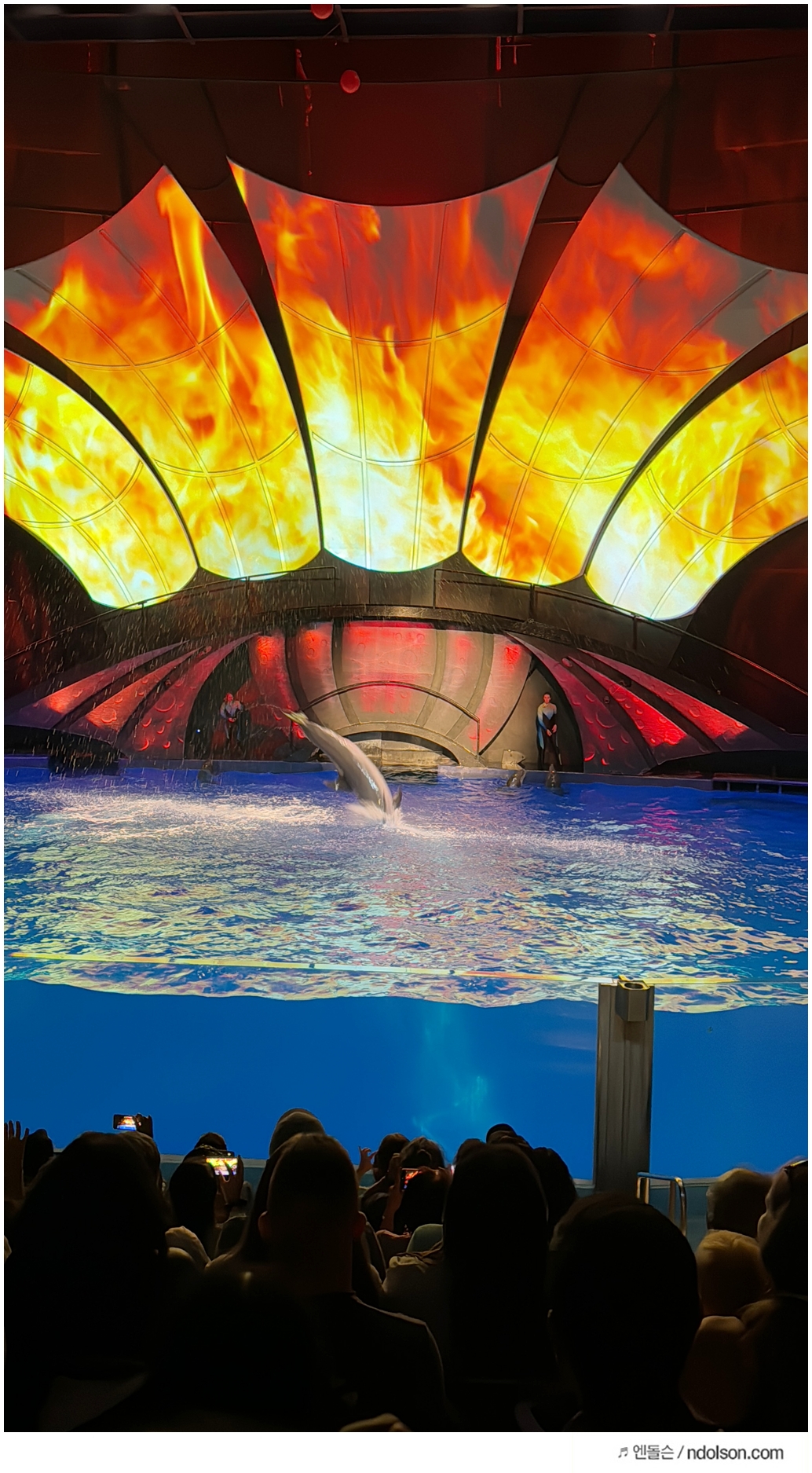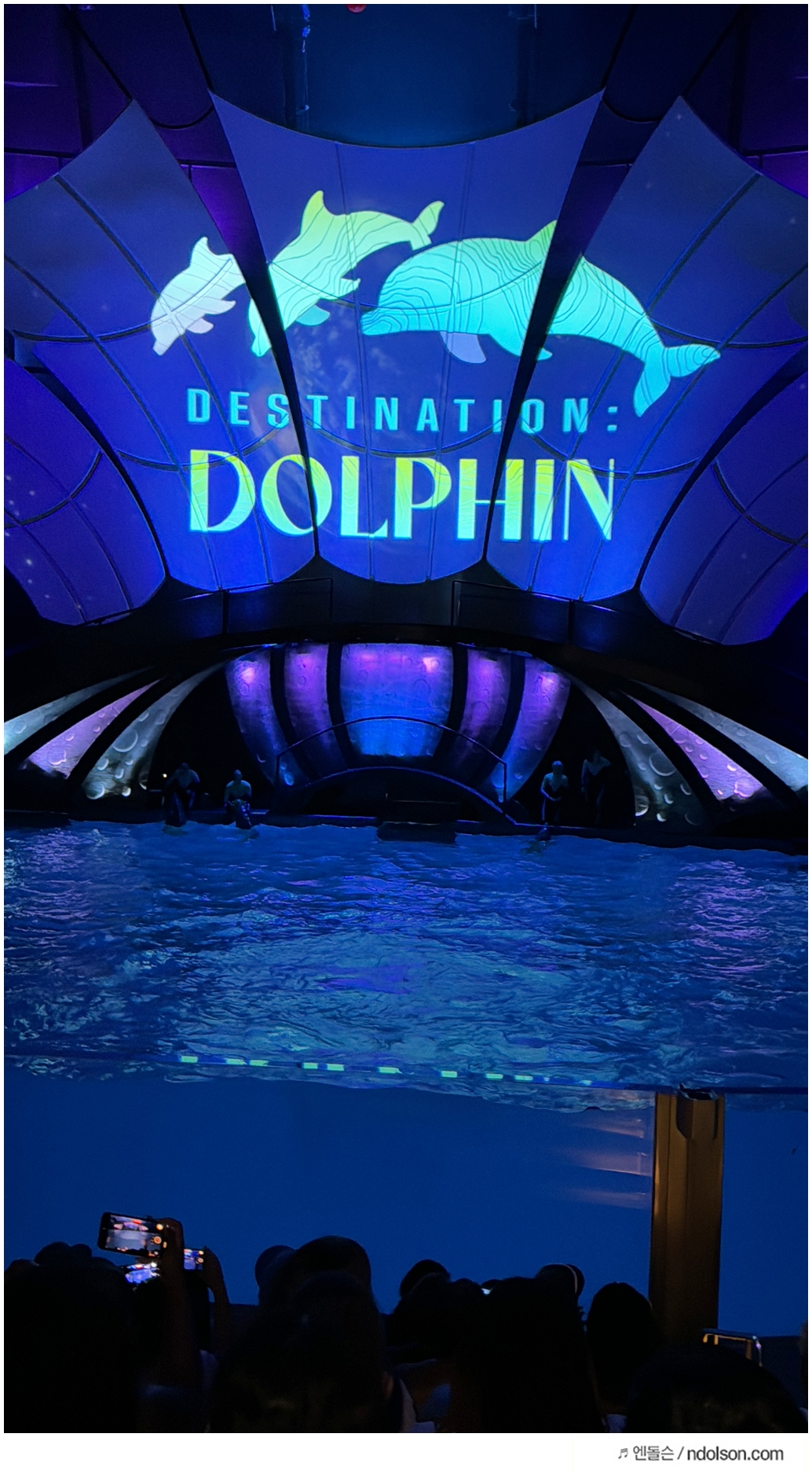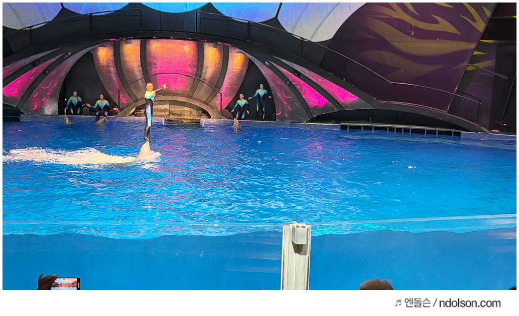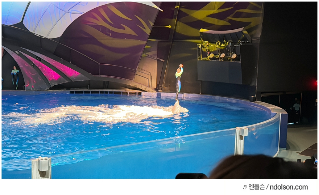 스크린이 대형스크린인데 너무 재미있습니다. 단순히 쇼가 아니라 여기에서 돌고래를 어떻게 관리하고 있는지도 이야기해주는 소개 같은 쇼 였습니다. 그리고 돌고래를 타고 다니는데, 잠수해서 사람을 교체합니다. ㅎㅎㅎ