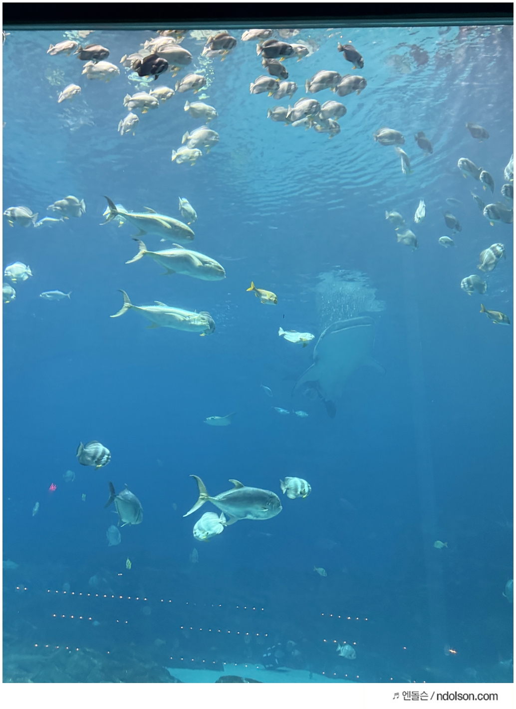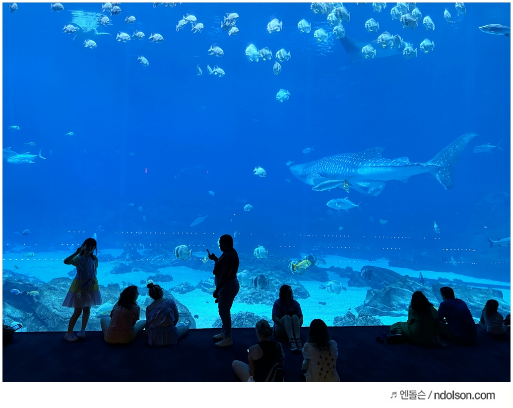 세계 최대 규모의 수조를 자랑하며, 고래상어, 가오리, 대형 참치류 등이 함께 서식합니다. 해저 터널을 따라 이동하며, 무빙워크를 통해 유유히 헤엄치는 생물들을 실감 나게 감상할 수 있습니다. 너무 커서 피곤할 때 유용했습니다.
