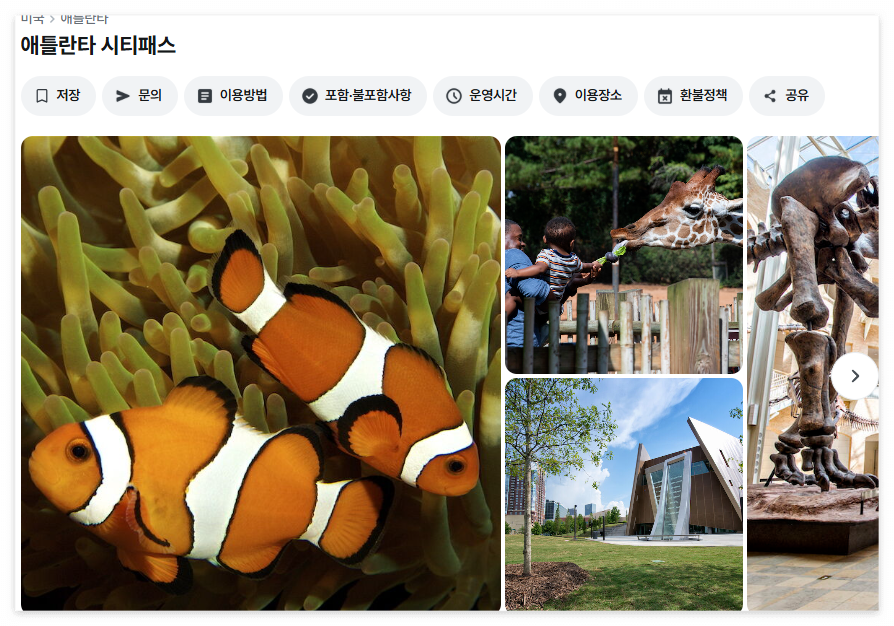 마이 리얼트립에서 구매하시면, 여러개 통합 티켓이 있습니다. 애틀란타 시티패스를 구매하면 아래의 5개의 어트랙션 입장료가 포함되어 있어 좋은데요. 필자도 월드 오브 코카콜라 가고 조지아 수족관 아쿠아리움도 갔거든요. 그리고 애틀란타 동물원까지 가려니 모두 한번에 구매하시는 게 좋습니다.